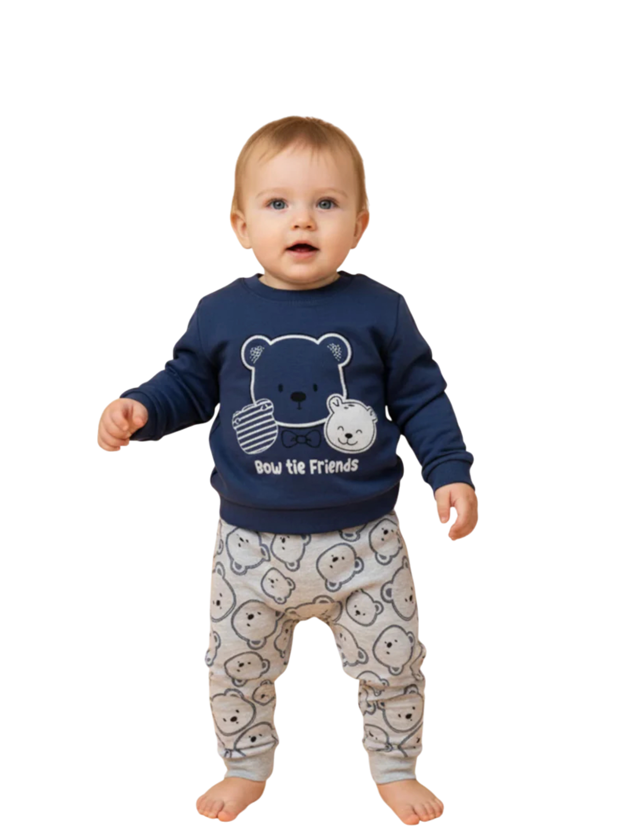 طقم أطفال ناعم ومريح من قطعتين، يتكون من سويت شيرت بطبعة دب جذابة وبنطال مطبوع متناسق. مصنوع من قطن ١٠٠٪ لراحة فائقة وتهوية ممتازة. مثالي للارتداء اليومي.