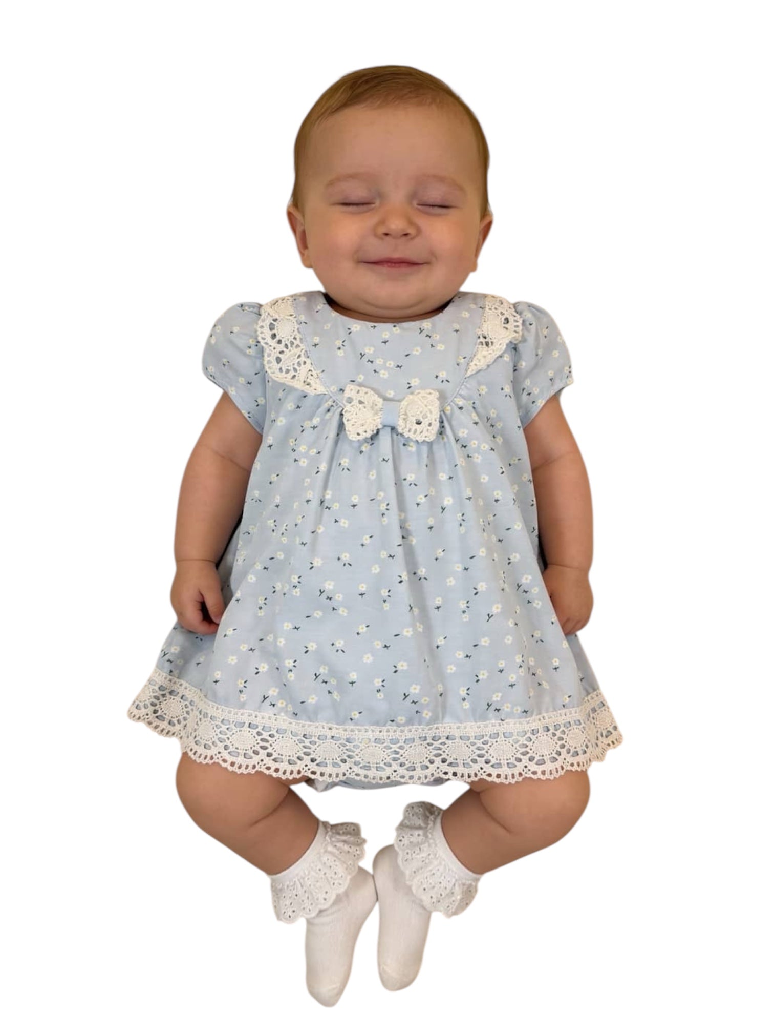 فستان رائع للأطفال الصغار يتميز بخلفية زرقاء مع طبعات زهور الأقحوان الصغيرة وتفاصيل من الدانتيل القطني. مصنوع من بطانة قطنية 100%، ليمنح أميراتك الصغيرات الراحة والأناقة. صنع في تركيا.