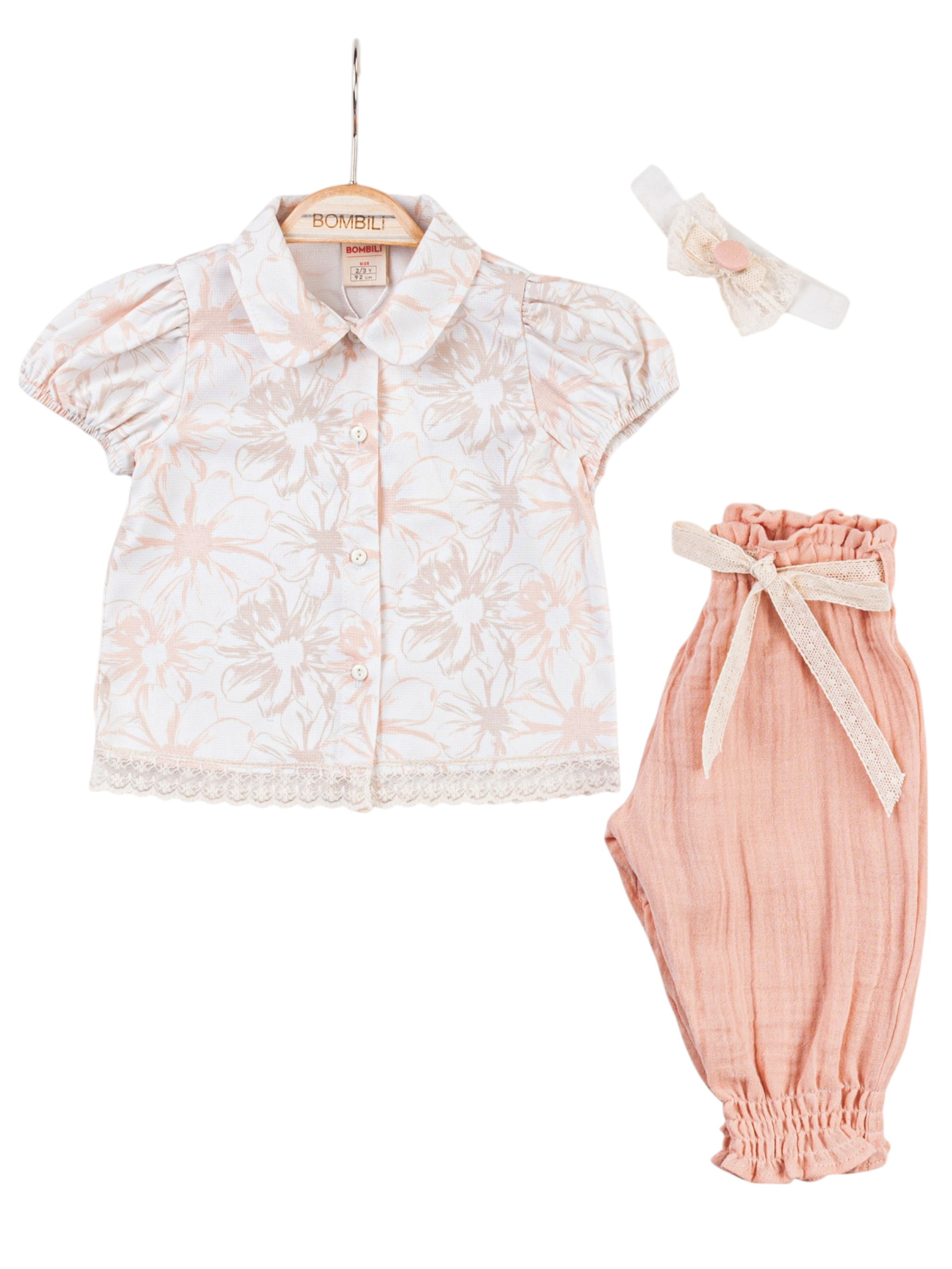 طقم بنطال مزين بدانتيل مزهر - لون السلمون