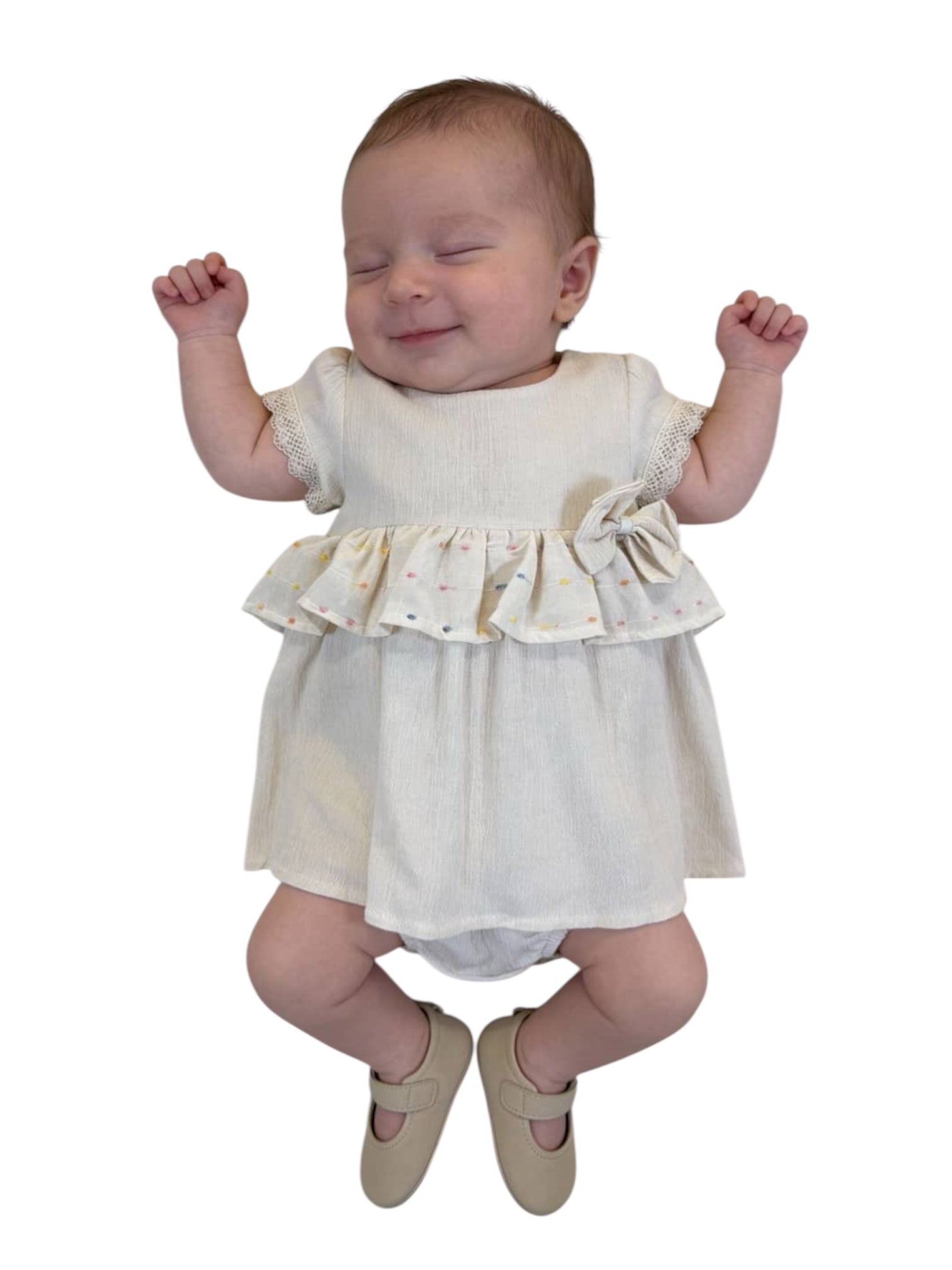 هذه رومبر إيكرو للبنات الصغيرات، يتميز بتنورة مكشكشة وعقدة منقطة ملونة. صُنع في تركيا من قطن ١٠٠٪.