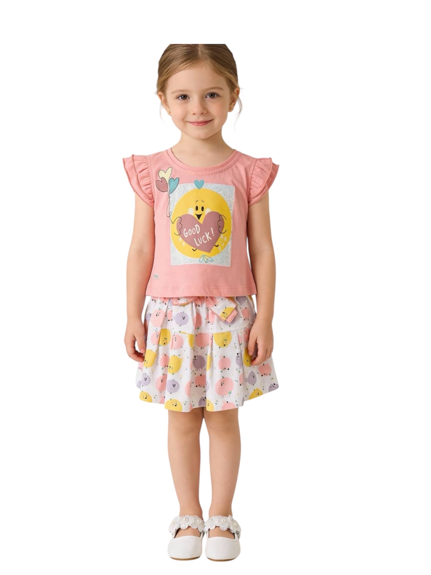 طقم الأطفال الرائع هذا يتضمن تيشيرتًا مطبوعًا عليه عبارة "حظًا سعيدًا!" وتنورة مطابقة. مصمم باللون الوردي، مصنوع من قطن ١٠٠٪، لطيف على بشرة طفلك الرقيقة ومريح للارتداء اليومي. صنع في تركيا.