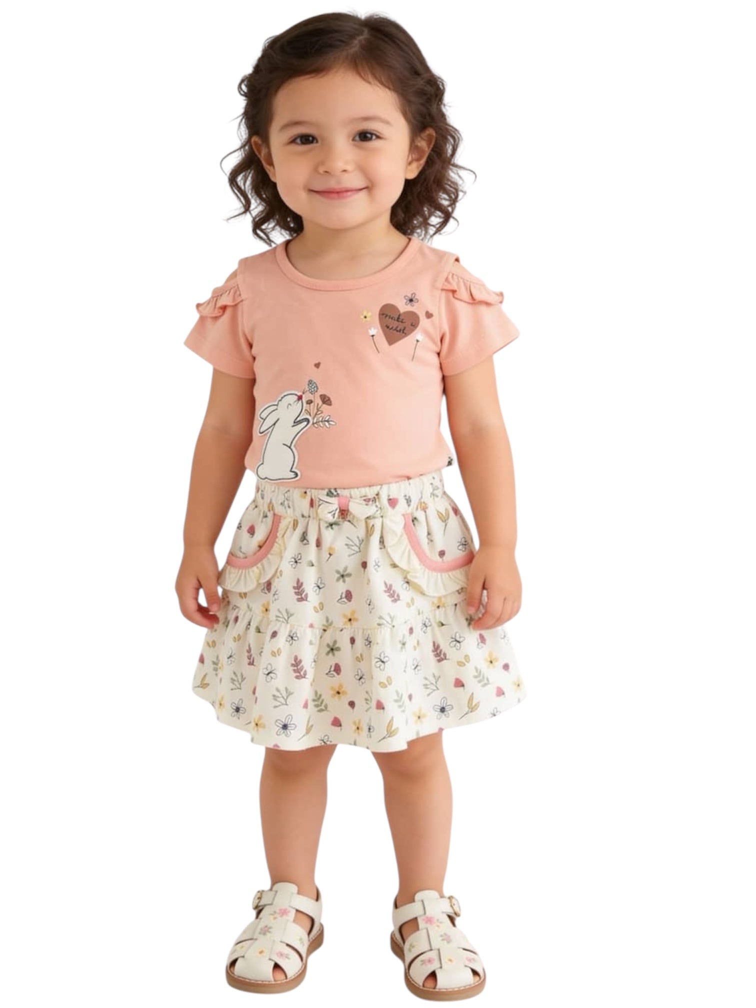 طقم الأطفال الرائع هذا يتضمن تيشيرتًا مطبوعًا عليه عبارة "تمنى أمنية" وتنورة مطابقة. مصمم بلون السلمون، مصنوع من قطن ١٠٠٪، لطيف على بشرة طفلك الرقيقة ومريح للارتداء اليومي. صنع في تركيا.