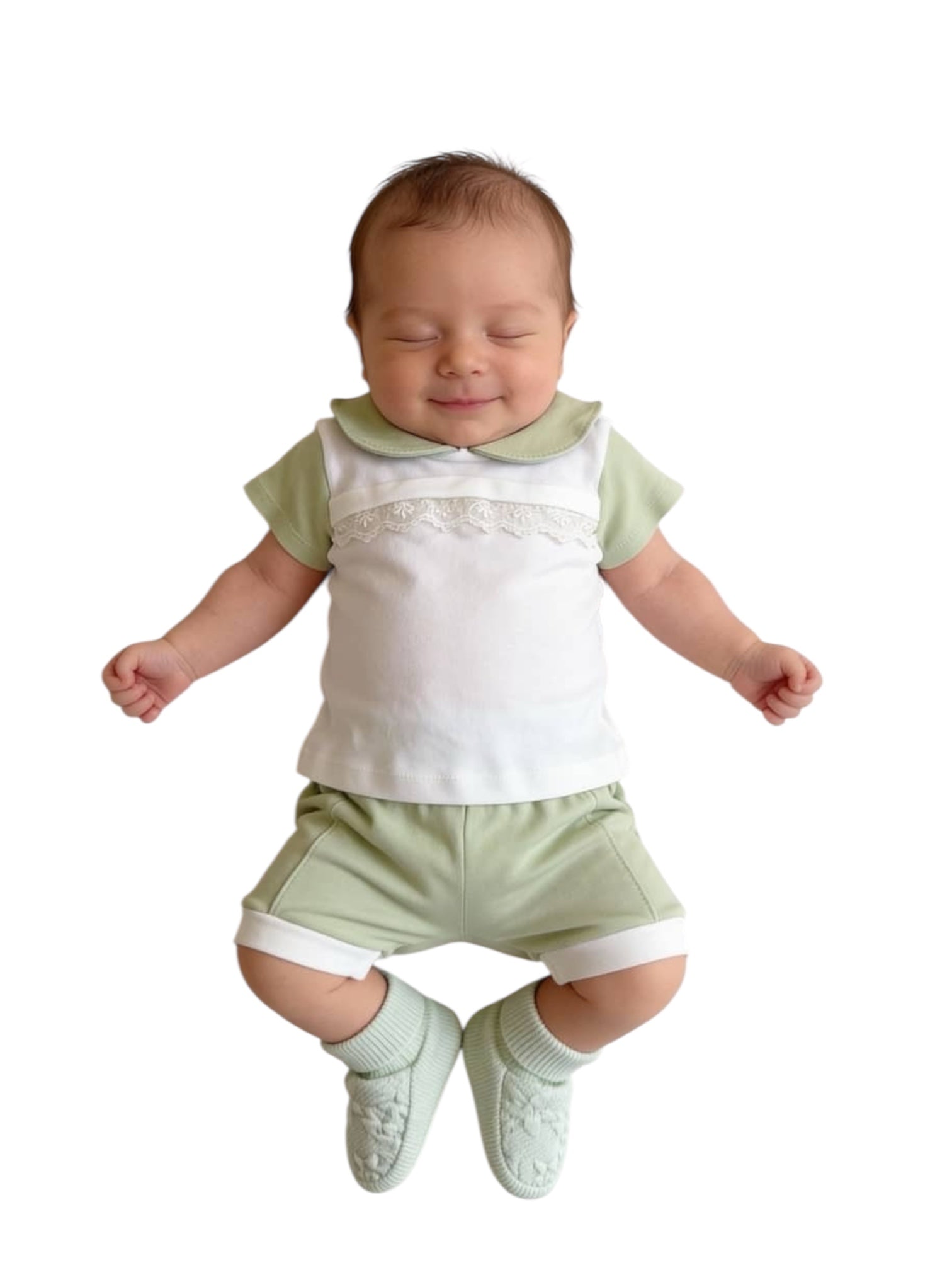 يتميز الجزء العلوي بجسم أبيض بأكمام وياقة خضراء، مع تفاصيل دانتيل رقيقة. الشورت أخضر اللون مع حزام خصر مطاطي وحواف بيضاء. مصنوع في تركيا، 100% قطن. نسيج ناعم ومسامي يضمن راحة طفلك، ويبقيه سعيدًا ومرتاحًا طوال اليوم.