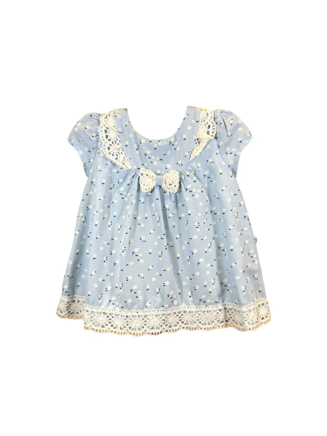 فستان رائع للأطفال الصغار يتميز بخلفية زرقاء مع طبعات زهور الأقحوان الصغيرة وتفاصيل من الدانتيل القطني. مصنوع من بطانة قطنية 100%، ليمنح أميراتك الصغيرات الراحة والأناقة. صنع في تركيا.