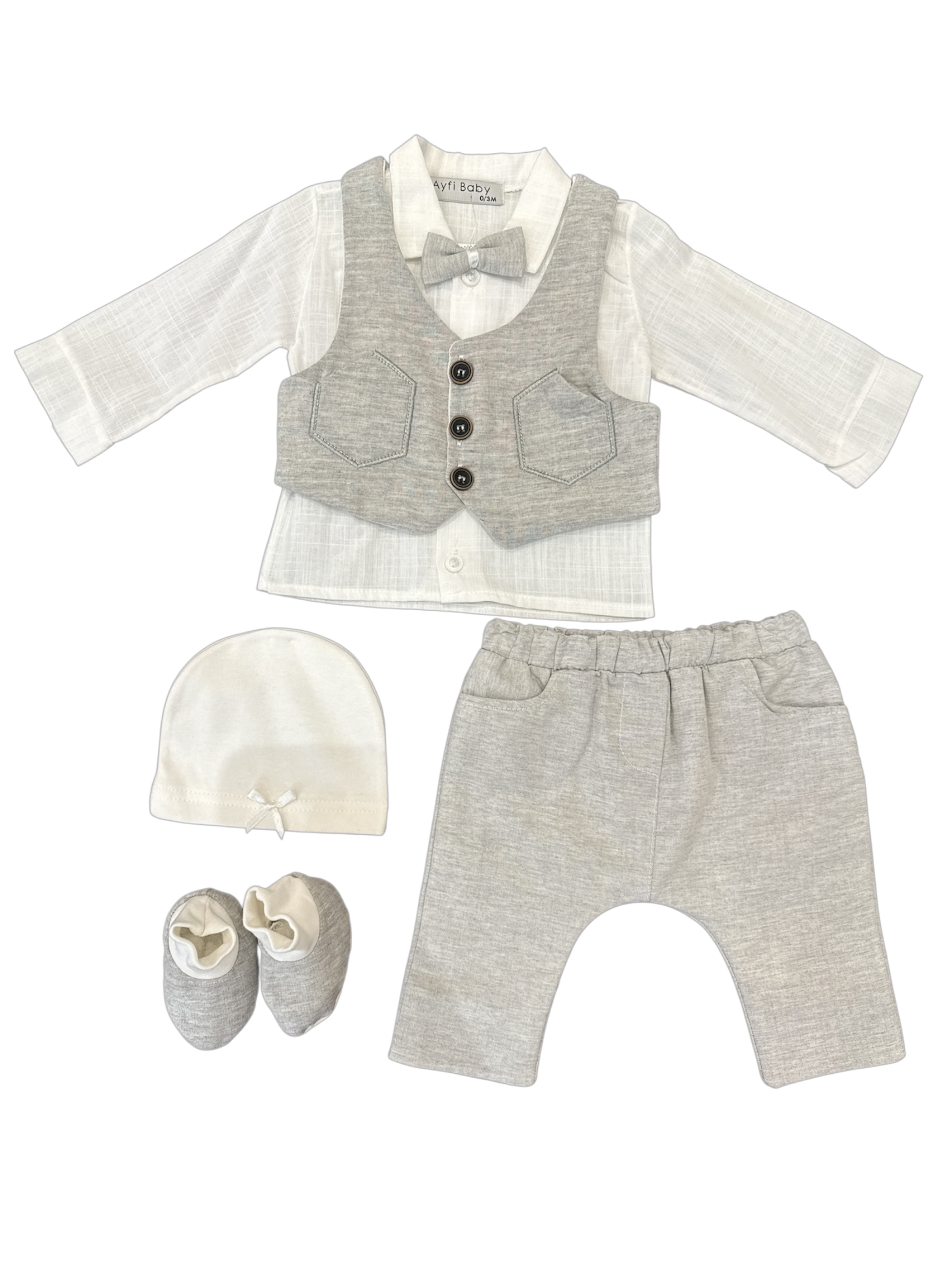 ألبسي مولودكِ الجديد بأناقة مع هذه المجموعة المكونة من خمس قطع، والتي تتضمن حذاءً من القماش نفسه، وقبعة قطنية بفيونكة جذابة، وقميصًا بتفاصيل صديري، وبنطالًا متناسقًا. مصنوعة في تركيا من قطن ناعم 100%، توفر الراحة والأناقة لطفلكِ الصغير.