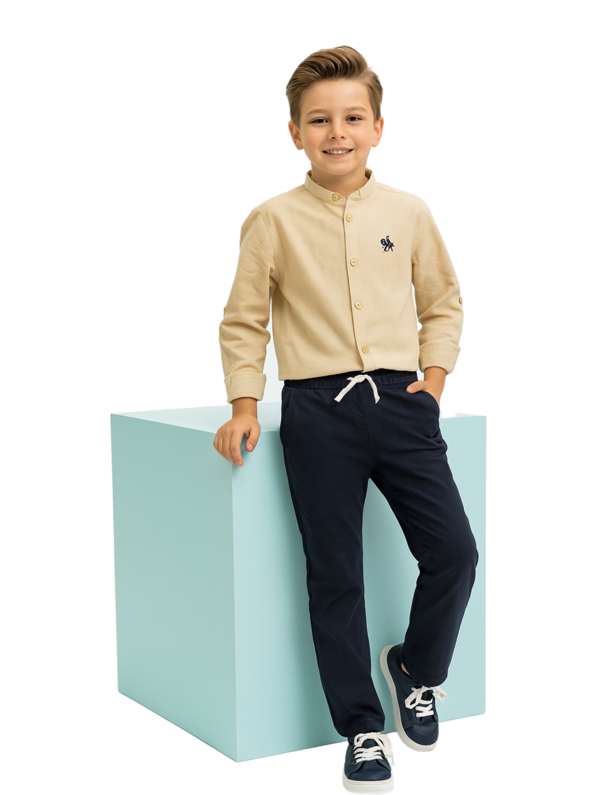 طقم الأولاد هذا المكون من قطعتين يمنحكِ مظهرًا خفيفًا ومريحًا وأنيقًا، مع قميص بوبلين بلون البيج الفاتح، مصنوع من مزيج من ٥٩٪ قطن و٤١٪ بوليستر. يتميز بياقة قميص كلاسيكية وأكمام طويلة وقصة عادية، وهو مثالي للارتداء اليومي. يكتمل الطقم ببنطال كحلي من القطن ١٠٠٪، مما يعزز الراحة ويضفي لمسة عصرية. خيار مثالي لموسم الصيف. صنع في تركيا.