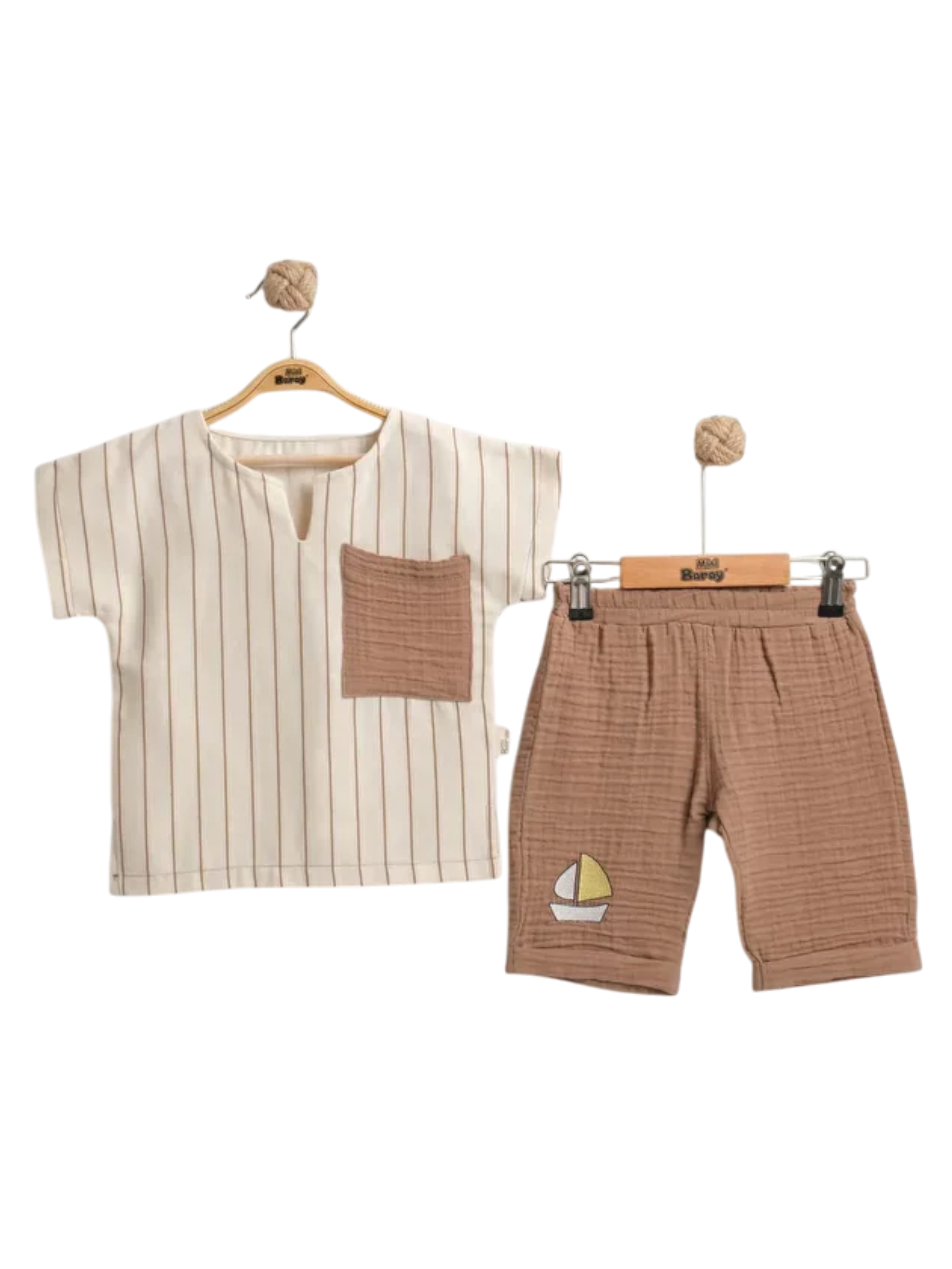 مصنوع من قماش موسلين قطني ١٠٠٪، يتميز طقم الصيف للأولاد هذا بملمس ناعم ولطيف على البشرة، ويسهل غسله في الغسالة على درجة حرارة ٣٠ درجة مئوية. يوفر القميص قصير الأكمام وياقة الدراجة والشورت المطابق الراحة وحرية الحركة والمظهر العصري. صُنع في تركيا، متين، يسمح بمرور الهواء، ومثالي للارتداء اليومي في الصيف.