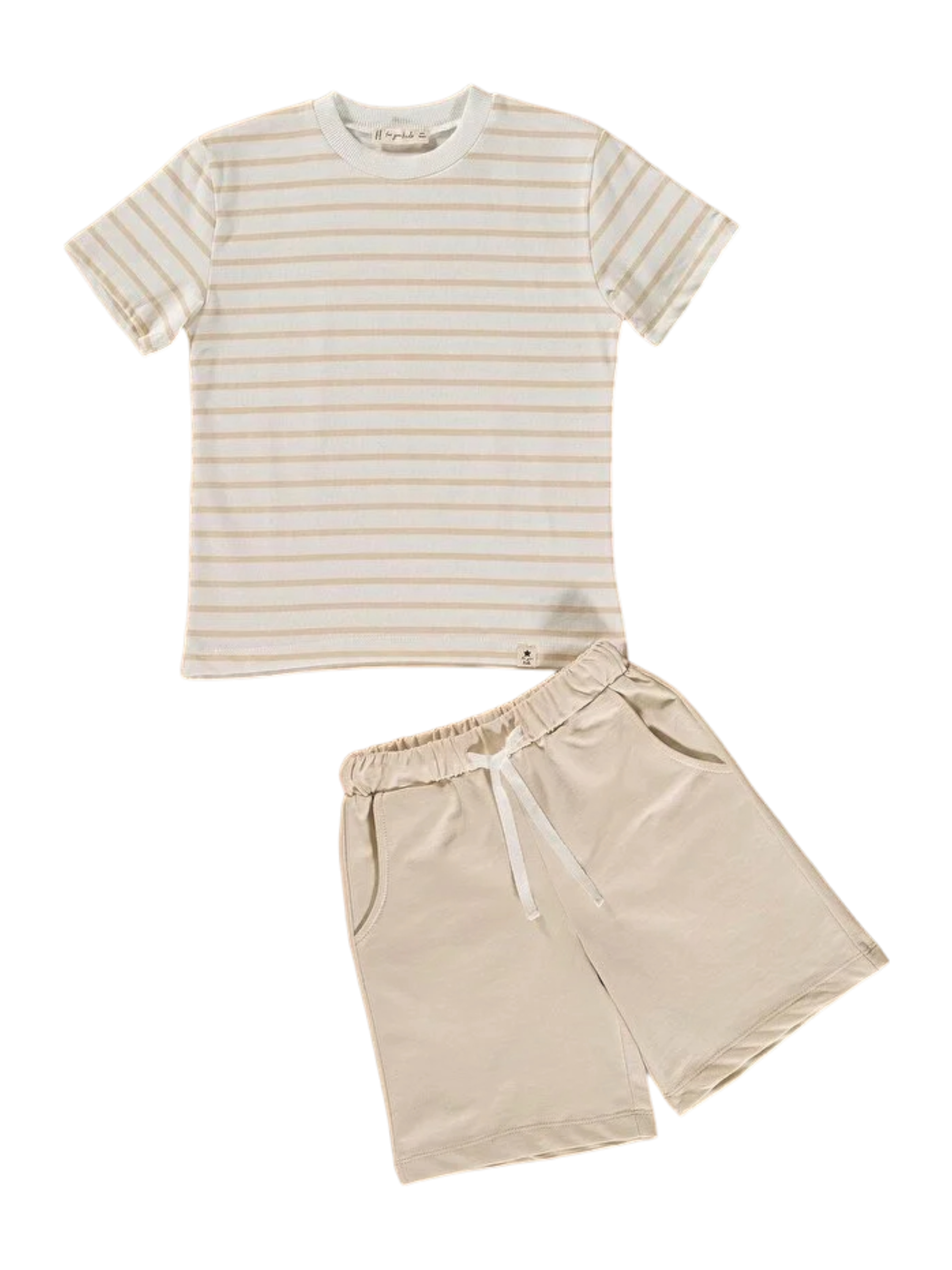 مصنوع من قماش موسلين قطني ١٠٠٪، يتميز طقم الصيف للأولاد هذا بملمس ناعم ولطيف على البشرة، ويسهل غسله في الغسالة على درجة حرارة ٣٠ درجة مئوية. يوفر القميص قصير الأكمام وياقة الدراجة والشورت المطابق الراحة وحرية الحركة والمظهر العصري. صُنع في تركيا، متين، يسمح بمرور الهواء، ومثالي للارتداء اليومي في الصيف.