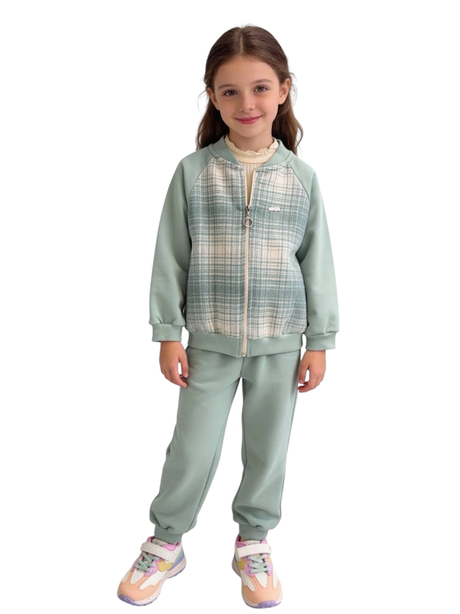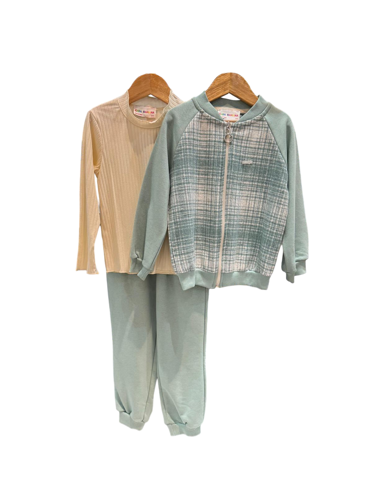 طقم مريح وعصري من ثلاث قطع، يتضمن جاكيت بسحاب بنقشة مربعات، وبنطال رياضي ناعم، وتيشيرت بأكمام طويلة، مثالي للارتداء اليومي. مصنوع من قطن ١٠٠٪ بنسيج مرن وعاكس. قصة عادية تسمح بحركة مريحة. صنع في تركيا.