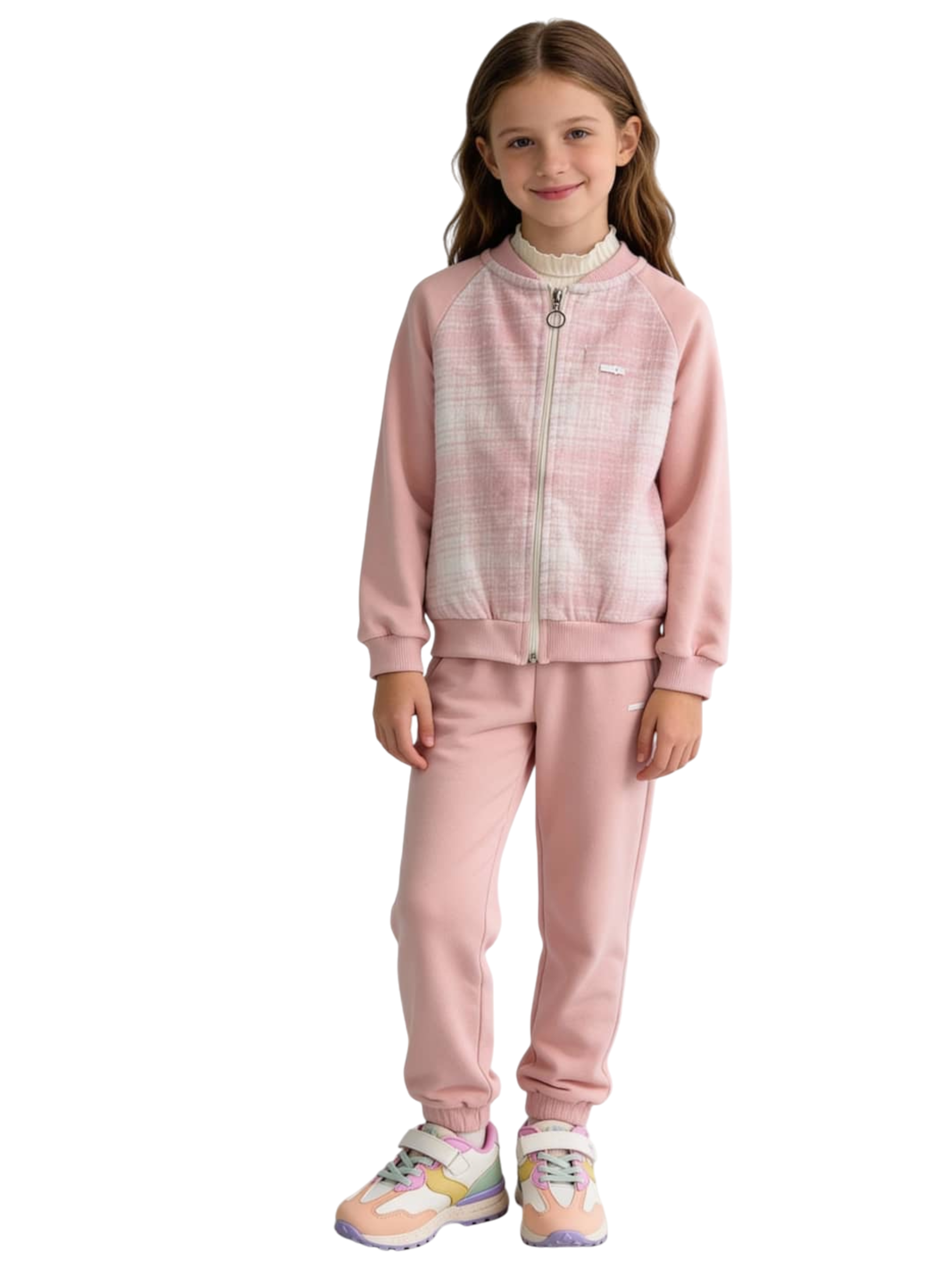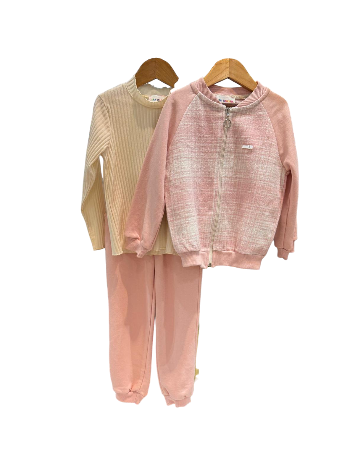 طقم مريح وعصري من ثلاث قطع، يتضمن جاكيت بسحاب بنقشة مربعات، وبنطال رياضي ناعم، وتيشيرت بأكمام طويلة، مثالي للارتداء اليومي. مصنوع من قطن ١٠٠٪ بنسيج مرن وعاكس. قصة عادية تسمح بحركة مريحة. صنع في تركيا.