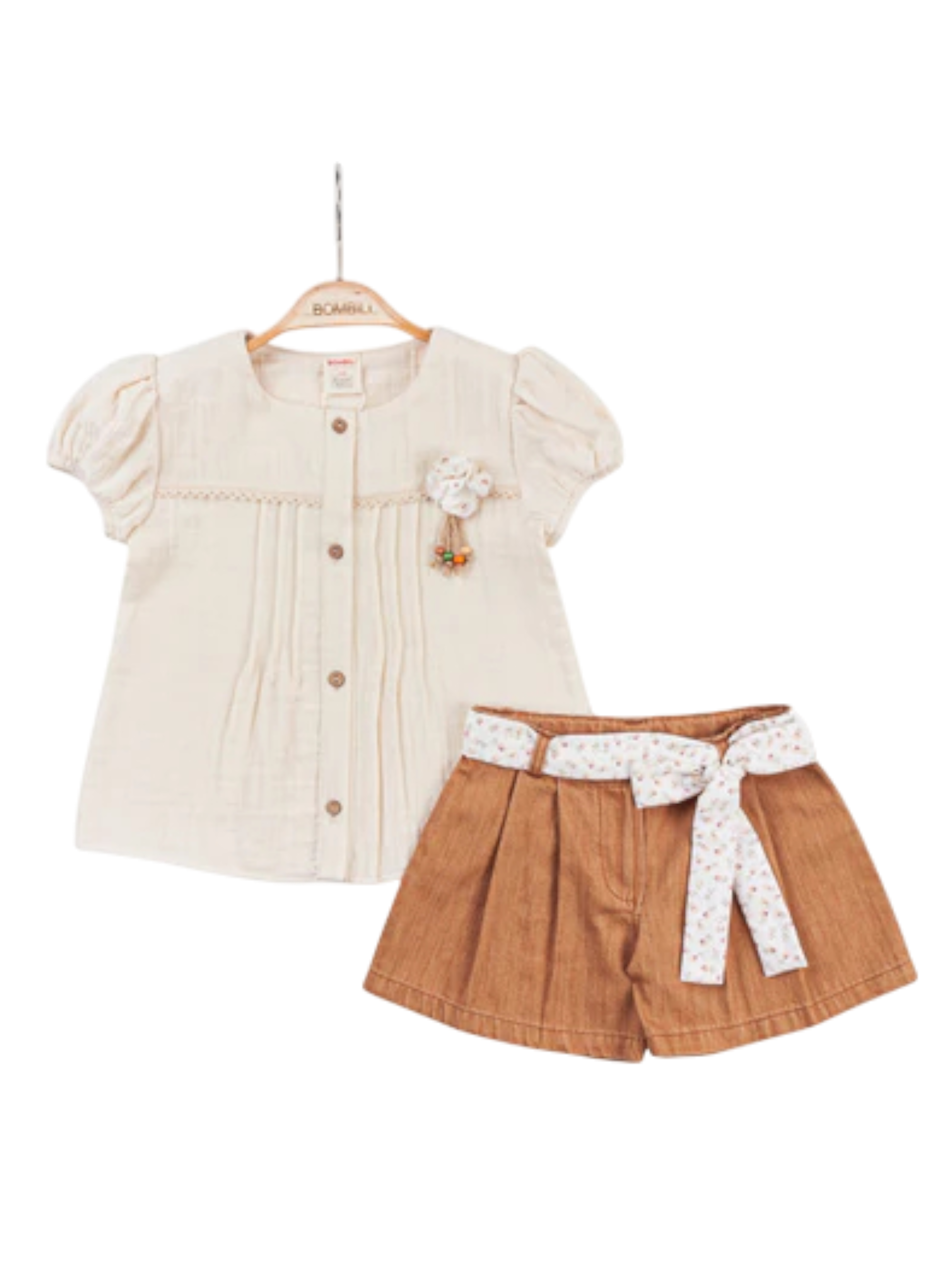 طقم بناتي ساحر بتصميم كلاسيكي من قطعتين، بلوزة وشورت. مصنوعان من قطن ١٠٠٪ لراحة لا مثيل لها. صنع في تركيا.