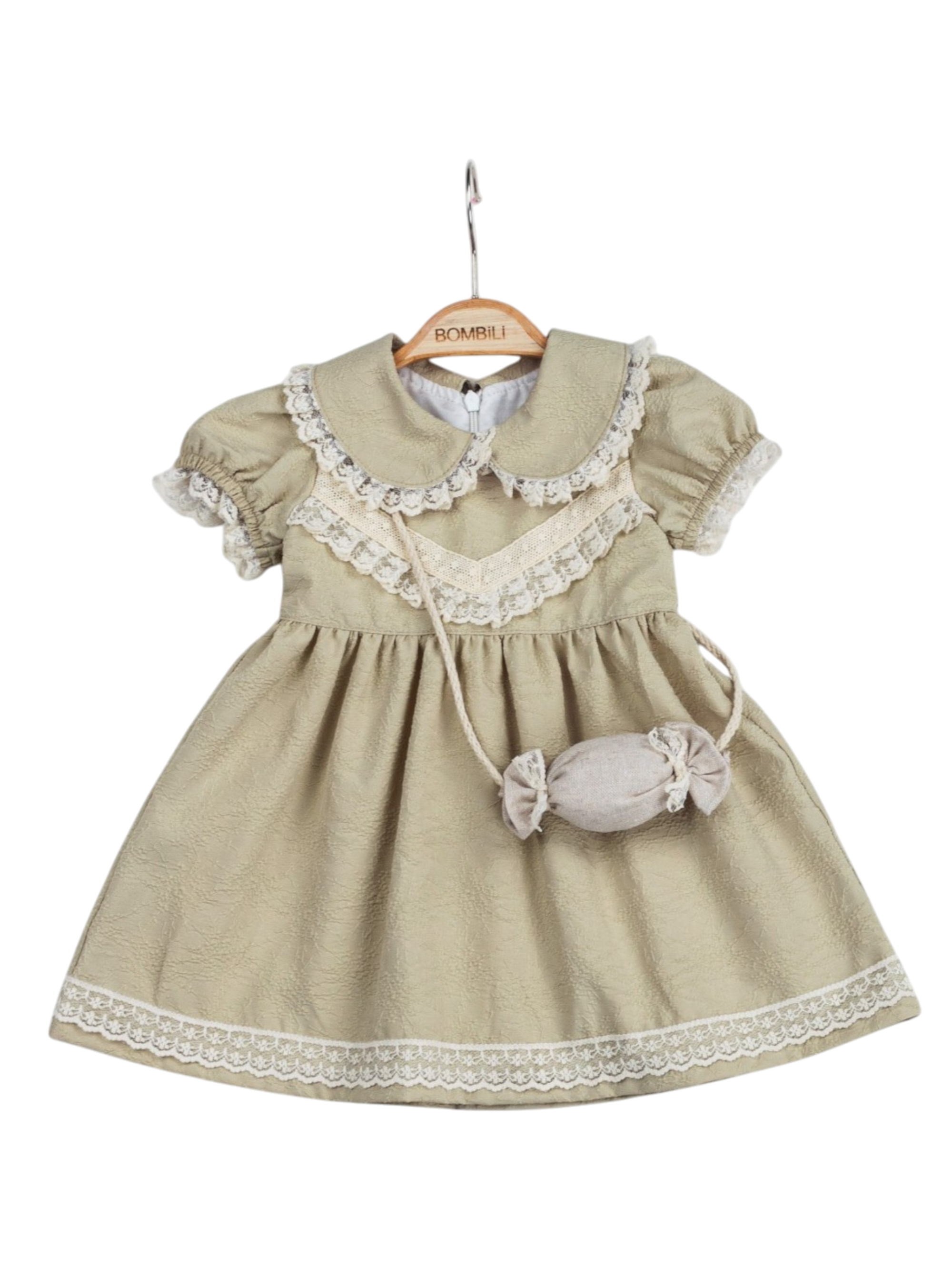 طقم فستان أنيق يتميز بياقة جاكار وتفاصيل فيونكة وحقيبة متطابقة.