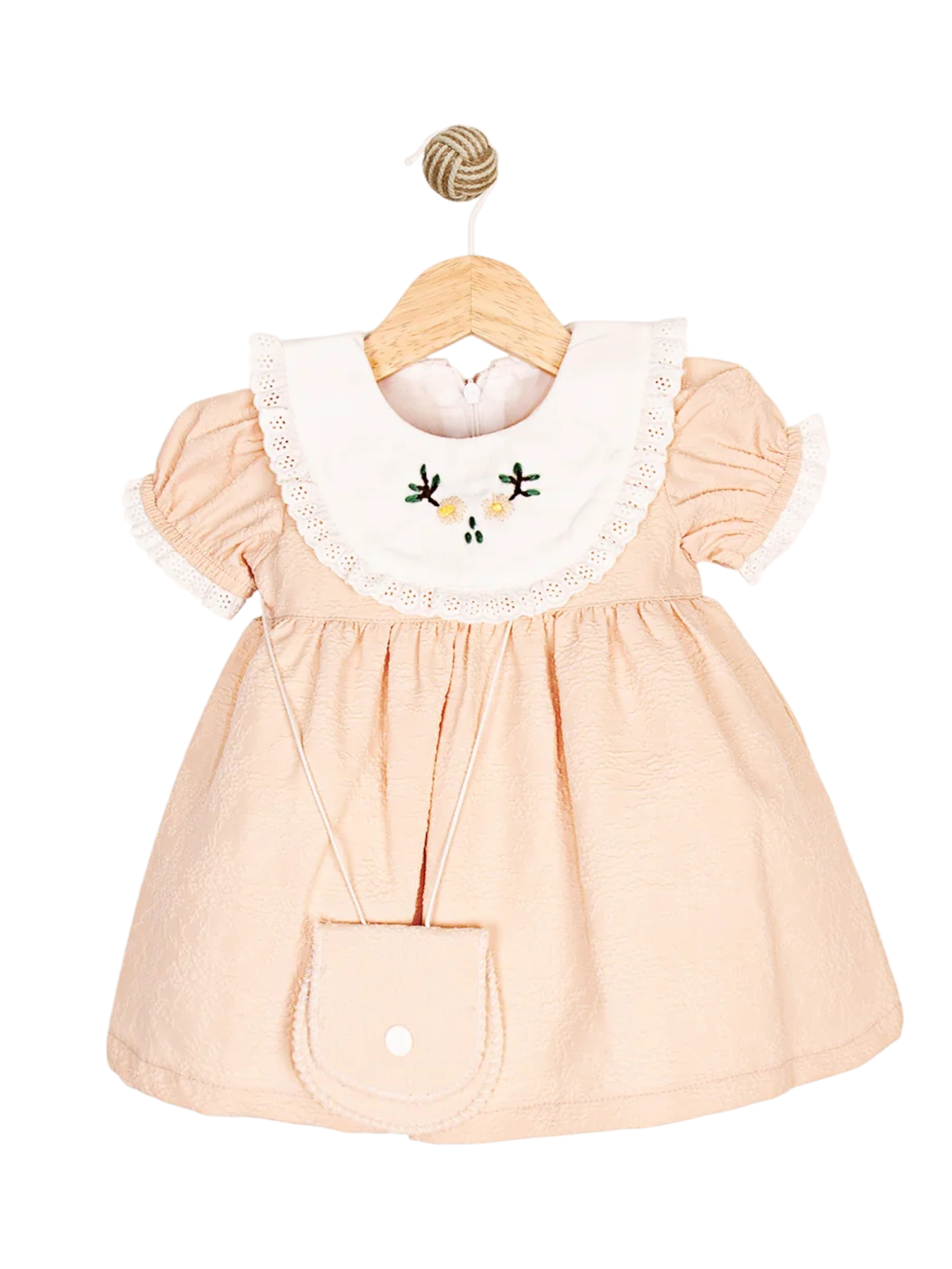 فستان أنيق بأكمام قصيرة للفتيات، بتفاصيل كشكشة، ودانتيل رقيق، وتطريز زهري على قماش قطني 100% يسمح بمرور الهواء. يتميز بياقة بيتر بان، وسحاب خلفي لسهولة الارتداء، وحقيبة كتف صغيرة مطابقة. مثالي للارتداء اليومي والمناسبات الخاصة. صنع في تركيا.