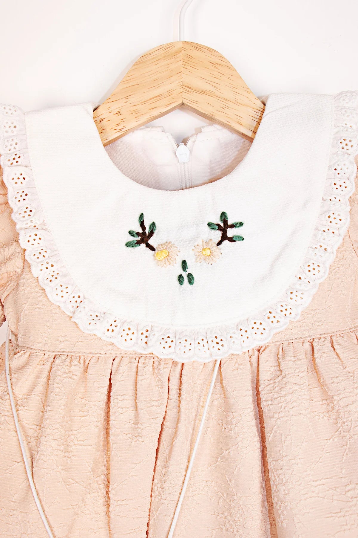 طقم فستان قطني مطرز بدانتيل مكشكش - بيج