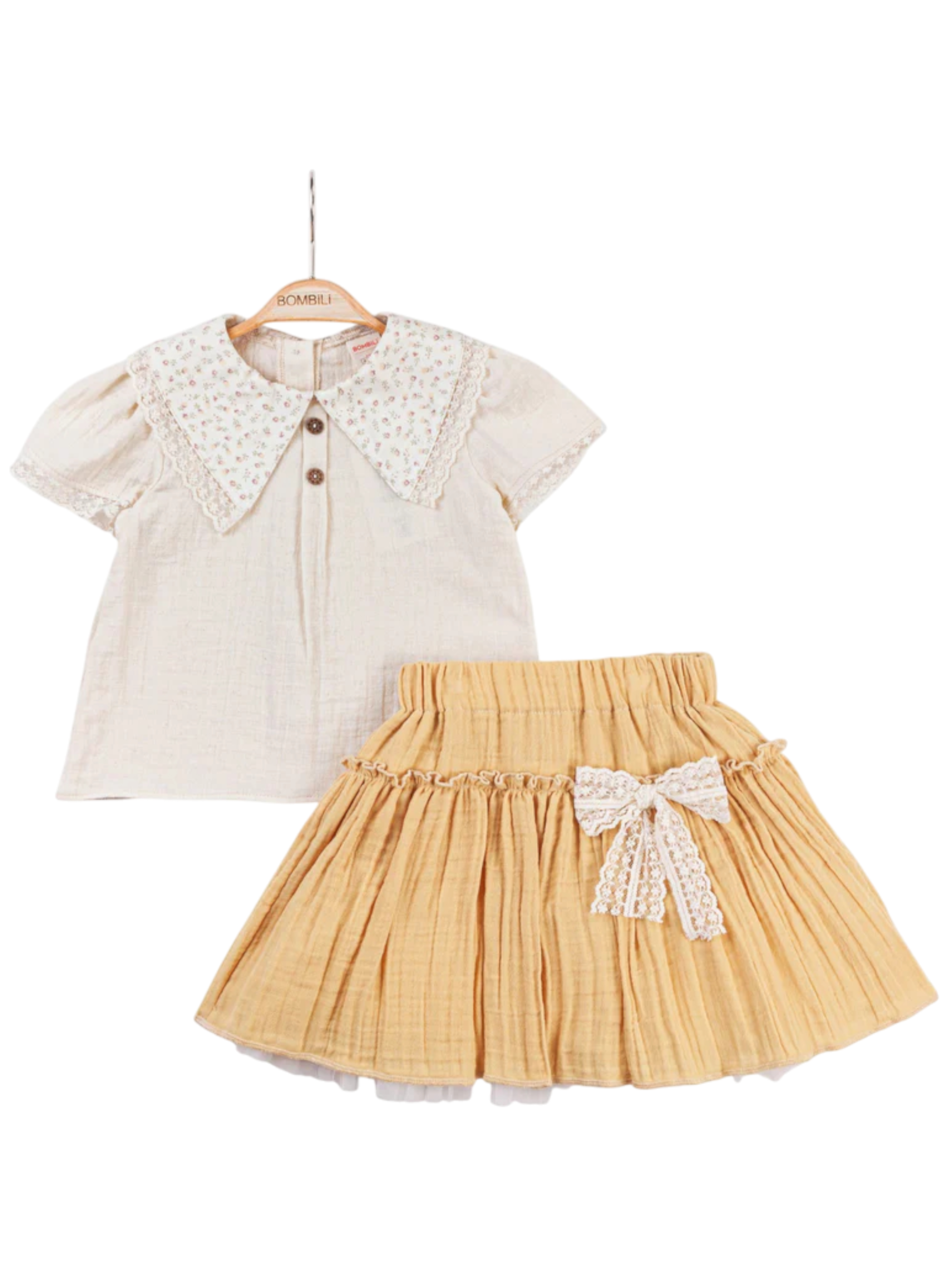 طقم بناتي ساحر من قطعتين، مصنوع من قماش الموسلين. يتضمن بلوزة بيج (100% قطن) وتنورة صفراء خردلية (100% قطن) ببطانة 70% قطن و30% بوليستر. صنع في تركيا.