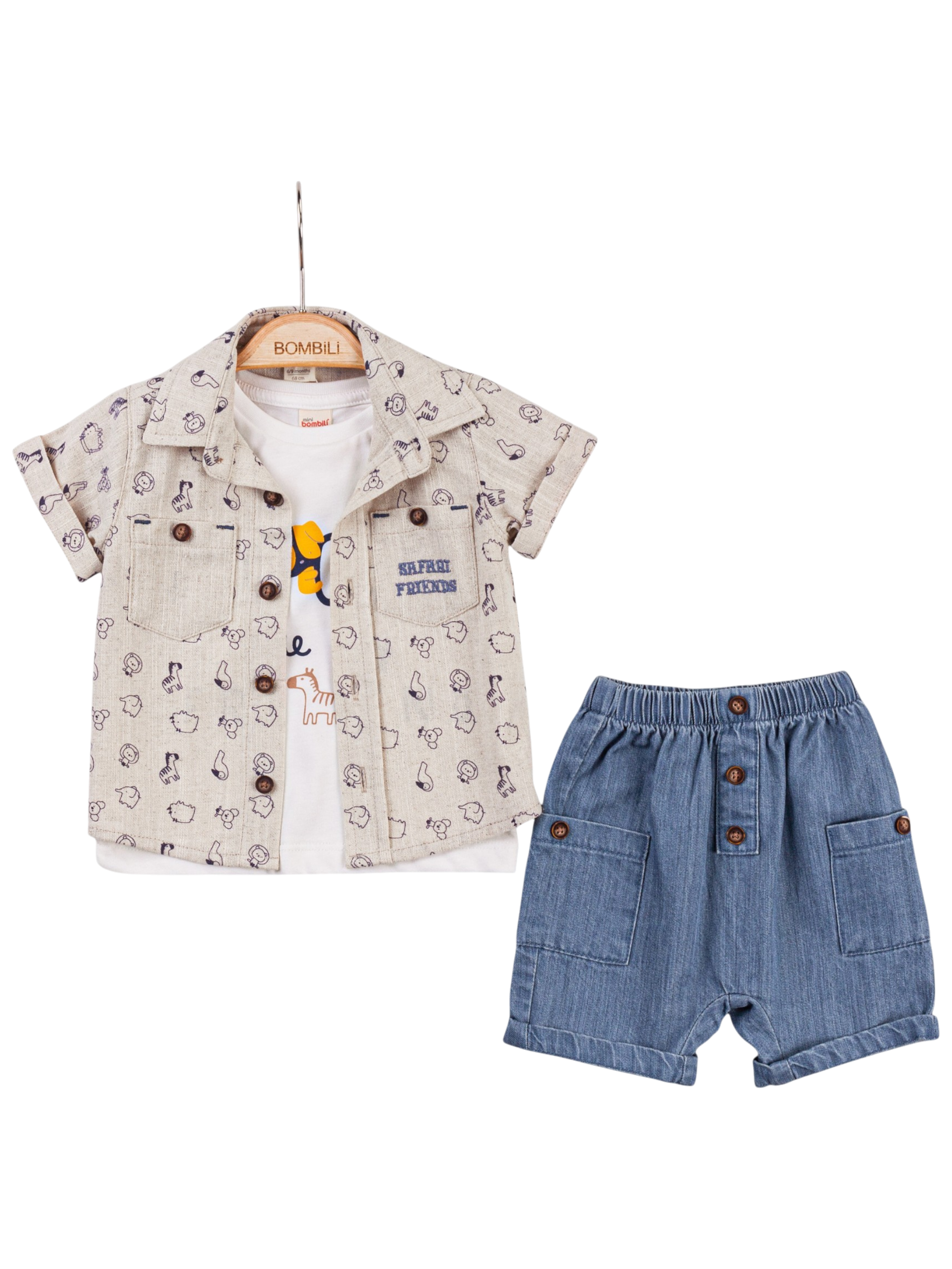 النوع: طقم من ثلاث قطع (قميص نصف كم + تي شيرت + شورت بخصر مطاطي)