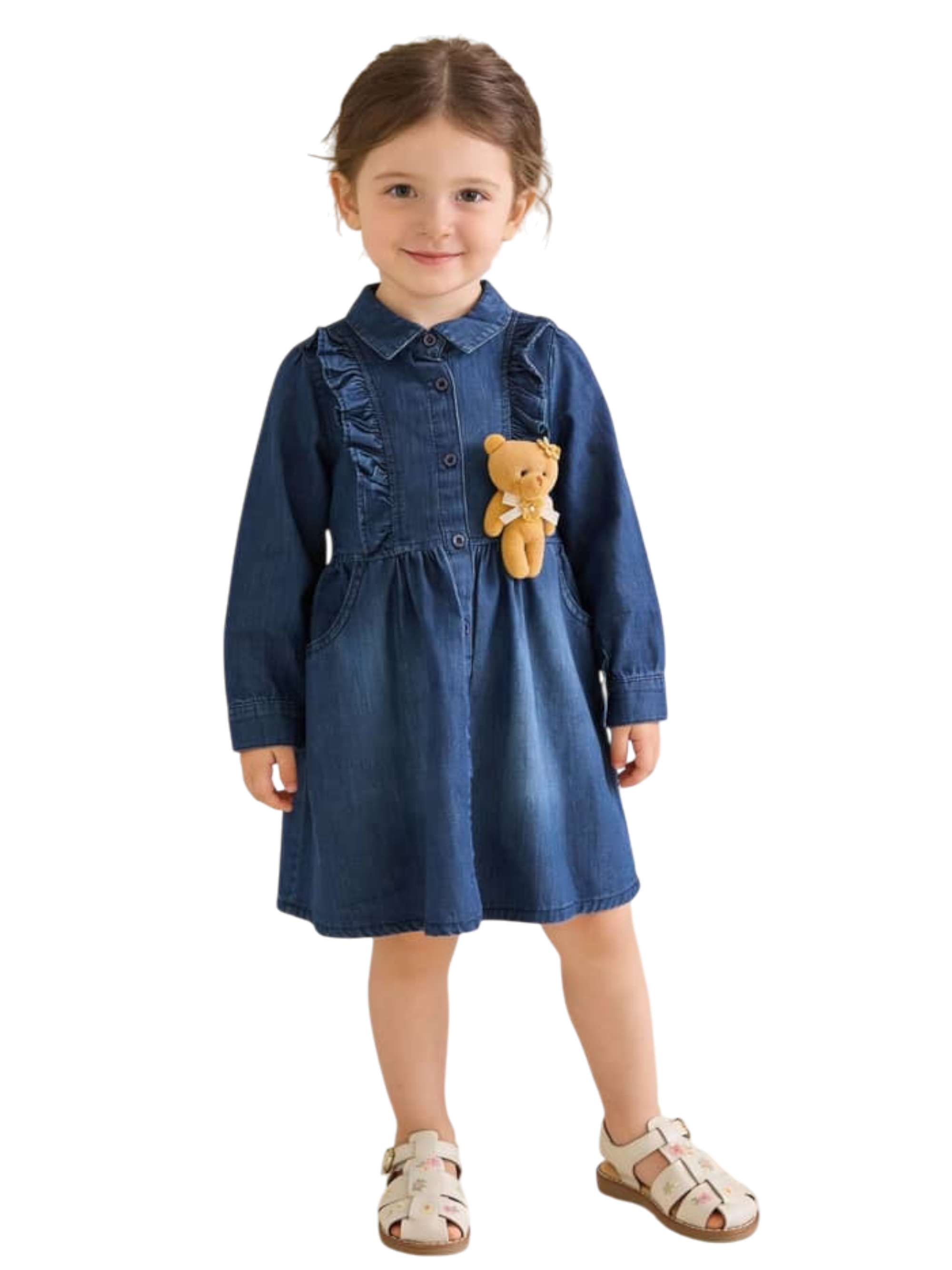 فستان جينز بأكمام طويلة مع إكسسوار على شكل دب تيدي. يمكن فصل الدب تيدي.