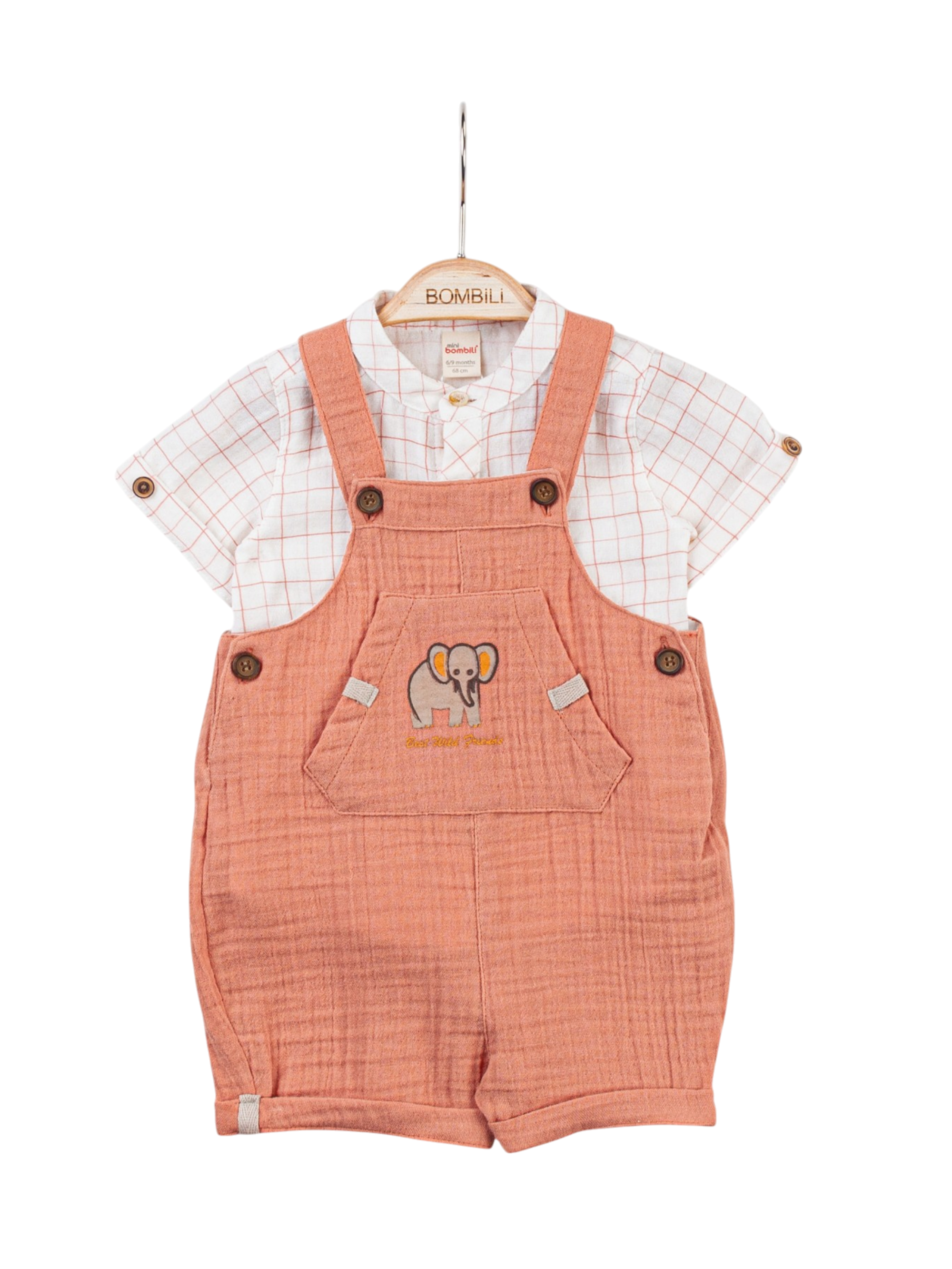 طقم رومبر-تيشيرت أنيق ومريح للأولاد، مصنوع من قماش قطني-كتان مسامي، يُبقي أطفالكم منتعشين في الصيف. تصميمه البسيط مع تطريز فيل ساحر يجعله مثاليًا للارتداء اليومي والمناسبات الخاصة.