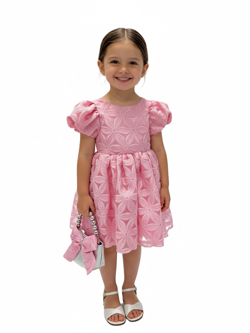 Set Includes: 1 Floral Lace Dress, 1 Matching Mini Purse.Design Features: Elegant puff sleeves and a large decorative back bow.
