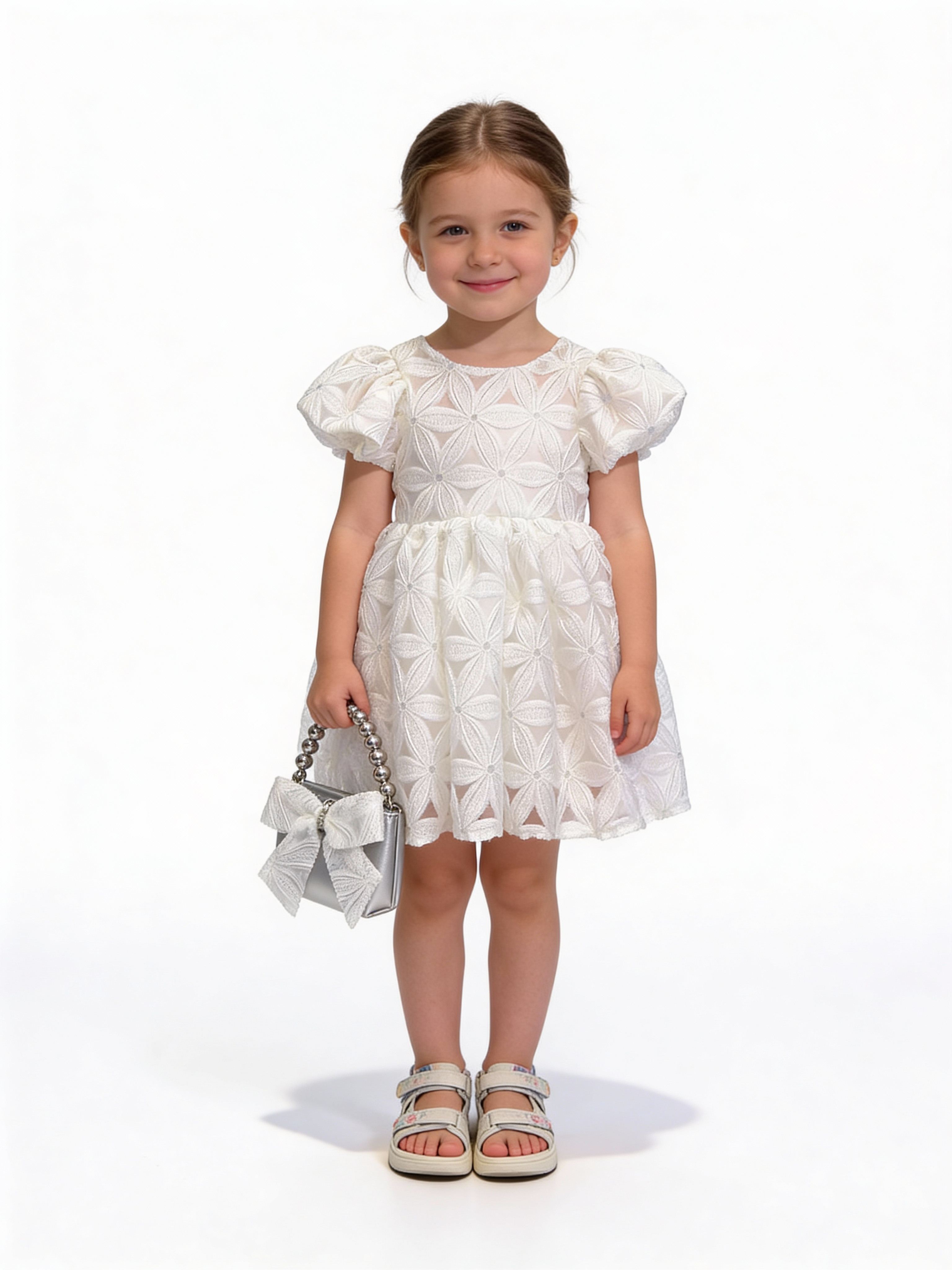 Set Includes: 1 Floral Lace Dress, 1 Matching Mini Purse.Design Features: Elegant puff sleeves and a large decorative back bow.