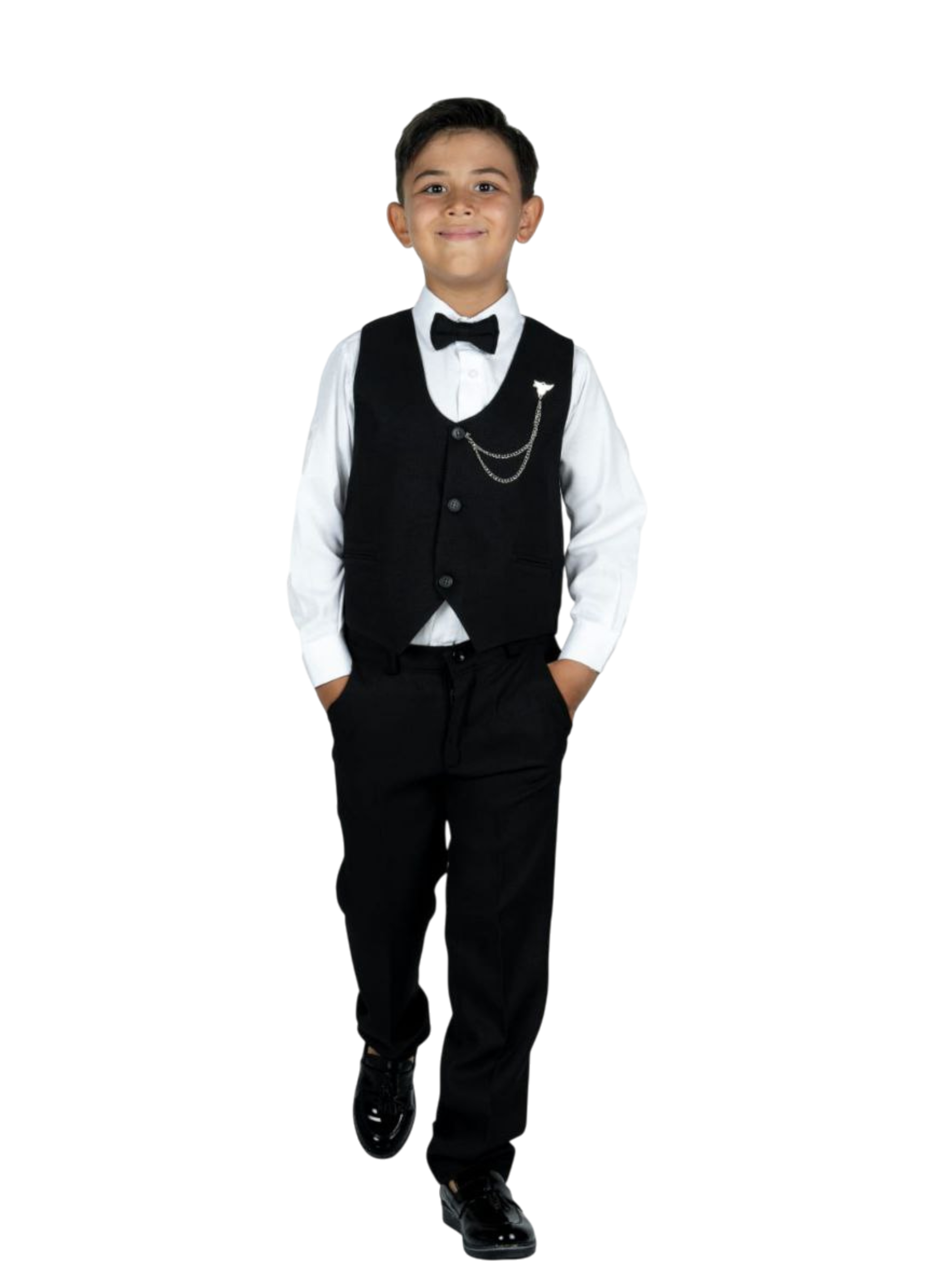 طقم البدلات للأولاد من خمس قطع يجمع بين الأناقة والراحة، ليمنحك إطلالة متكاملة للمناسبات الخاصة. يتضمن هذا الطقم الفاخر صدرية مصنوعة بدقة، وقميصًا كلاسيكيًا بأكمام طويلة، وبنطالًا مُفصّلًا، وربطة عنق متناسقة، وسلسلة أنيقة.