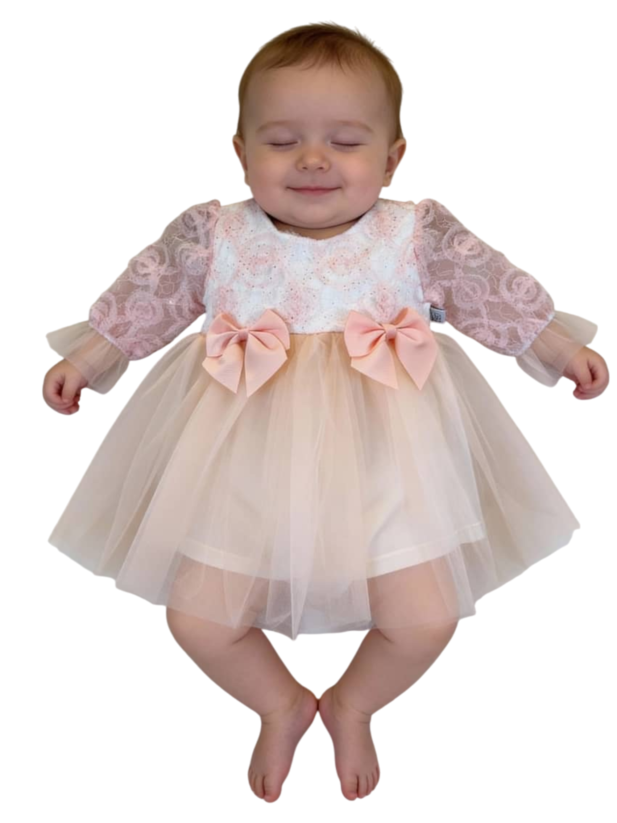 فستان بأكمام طويلة مع صدرية من الدانتيل الوردي ثلاثي الأبعاد وتنورة من التول متعدد الطبقات. مبطن بالكامل بالقطن لراحة لا مثيل لها.