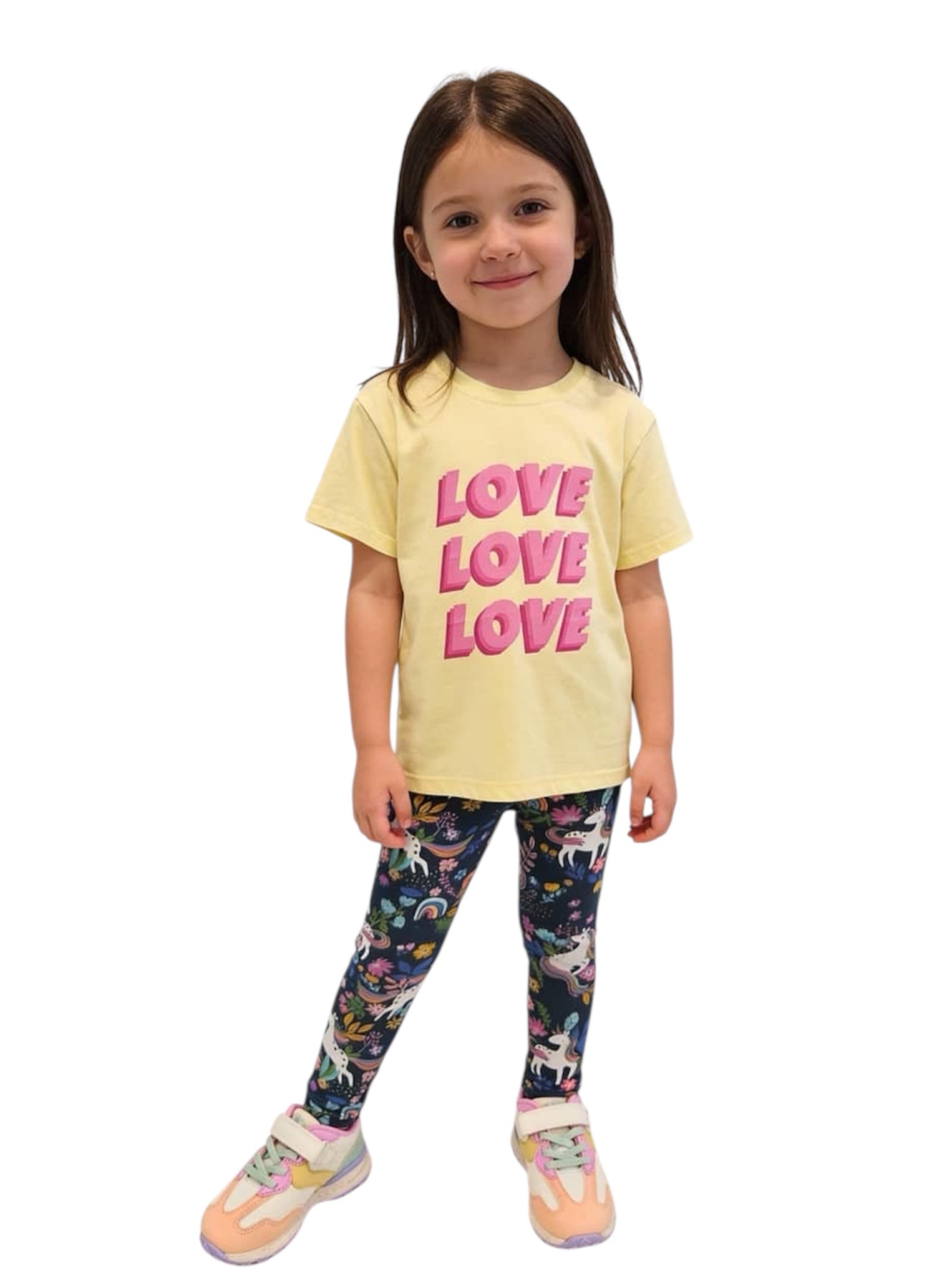 طقم بناتي يتكون من تيشيرت أصفر بأكمام قصيرة مزين بعبارات "LOVE LOVE LOVE" الجريئة، مع بنطال ضيق كحلي مزين بنقوش يونيكورن وزهور وقوس قزح ملونة. ناعم ومرن، مثالي للارتداء اليومي أو ملابس النوم. قطن ١٠٠٪. صنع في تركيا.