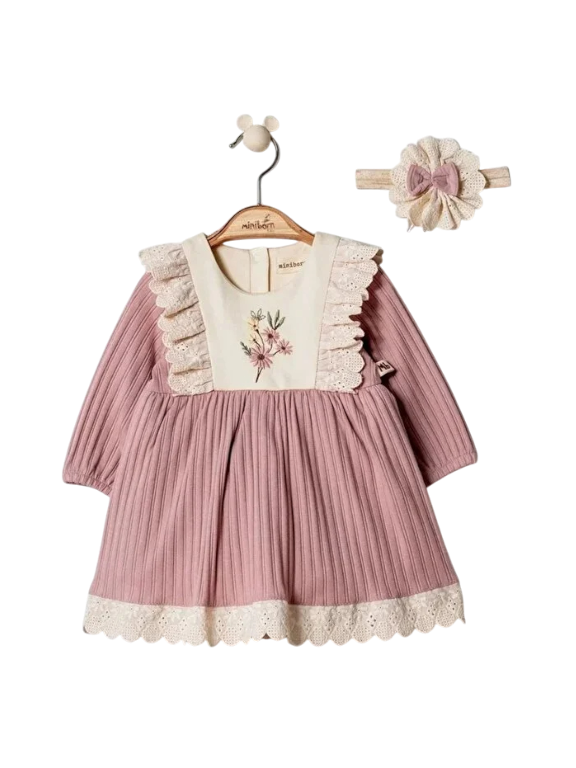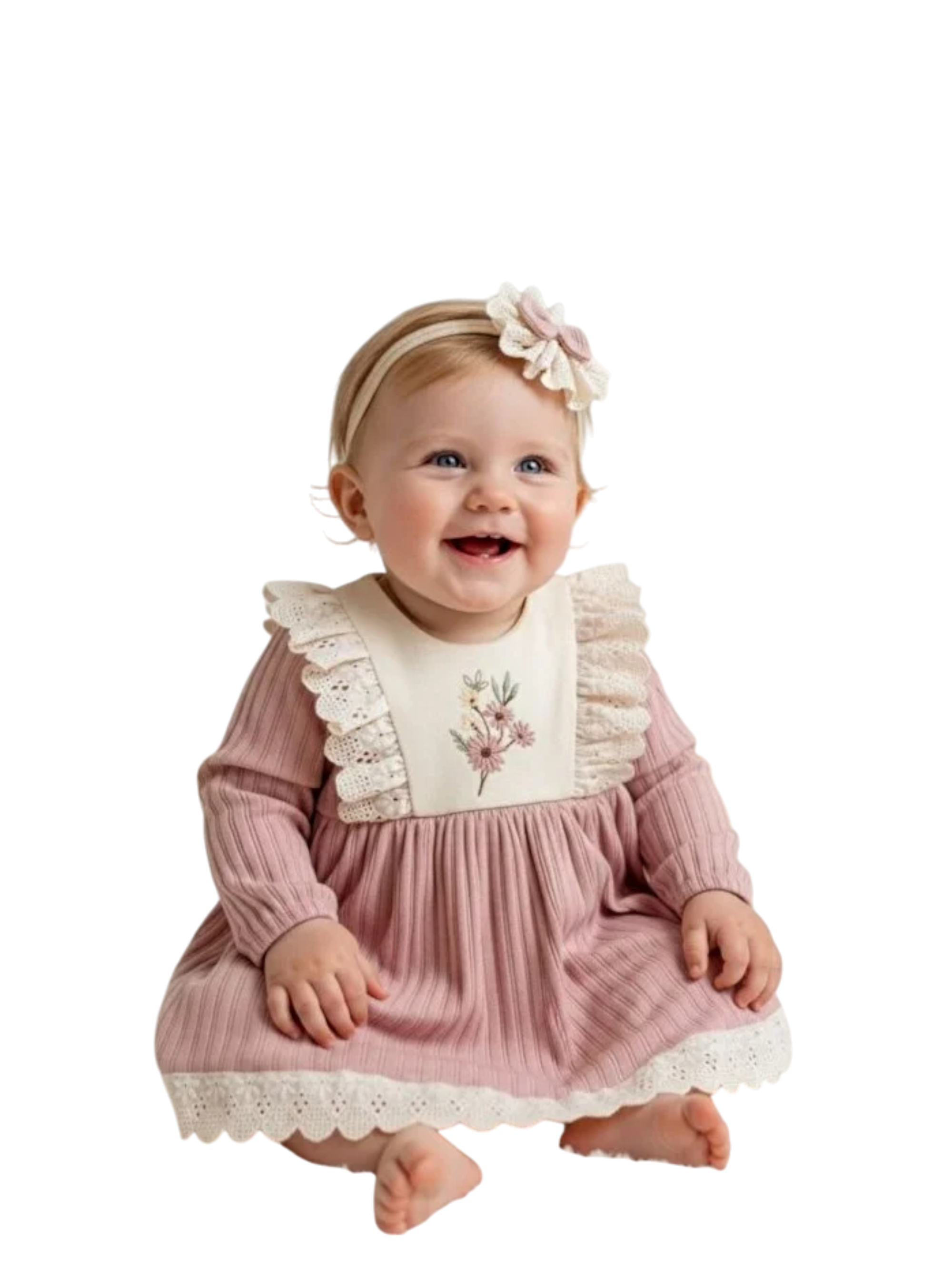 This adorable 100% cotton dress and bandana set is crafted with soft, skin-friendly fabric to keep your baby comfortable all day. The floral embroidery, tie-dye design, and corded fabric details add a charming touch. With its elastic hems, long sleeves, and flexible knitted texture, it offers a perfect fit and easy movement.