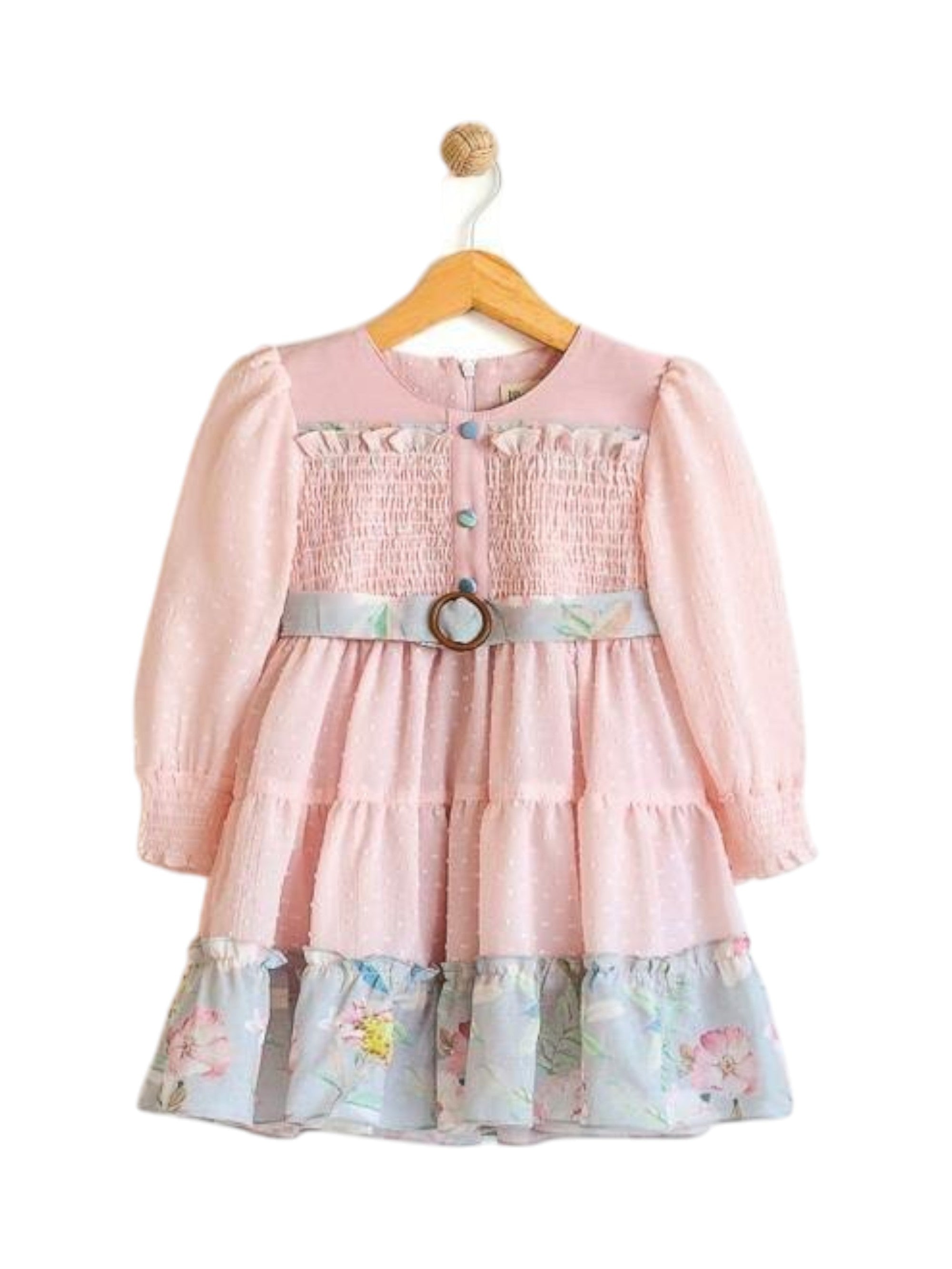 فستان شيفون وردي بأكمام طويلة مع حزام من القماش نفسه - 2Y تم طلبه مسبقًا وسيتم شحنه بمجرد عودته إلى المخزون.