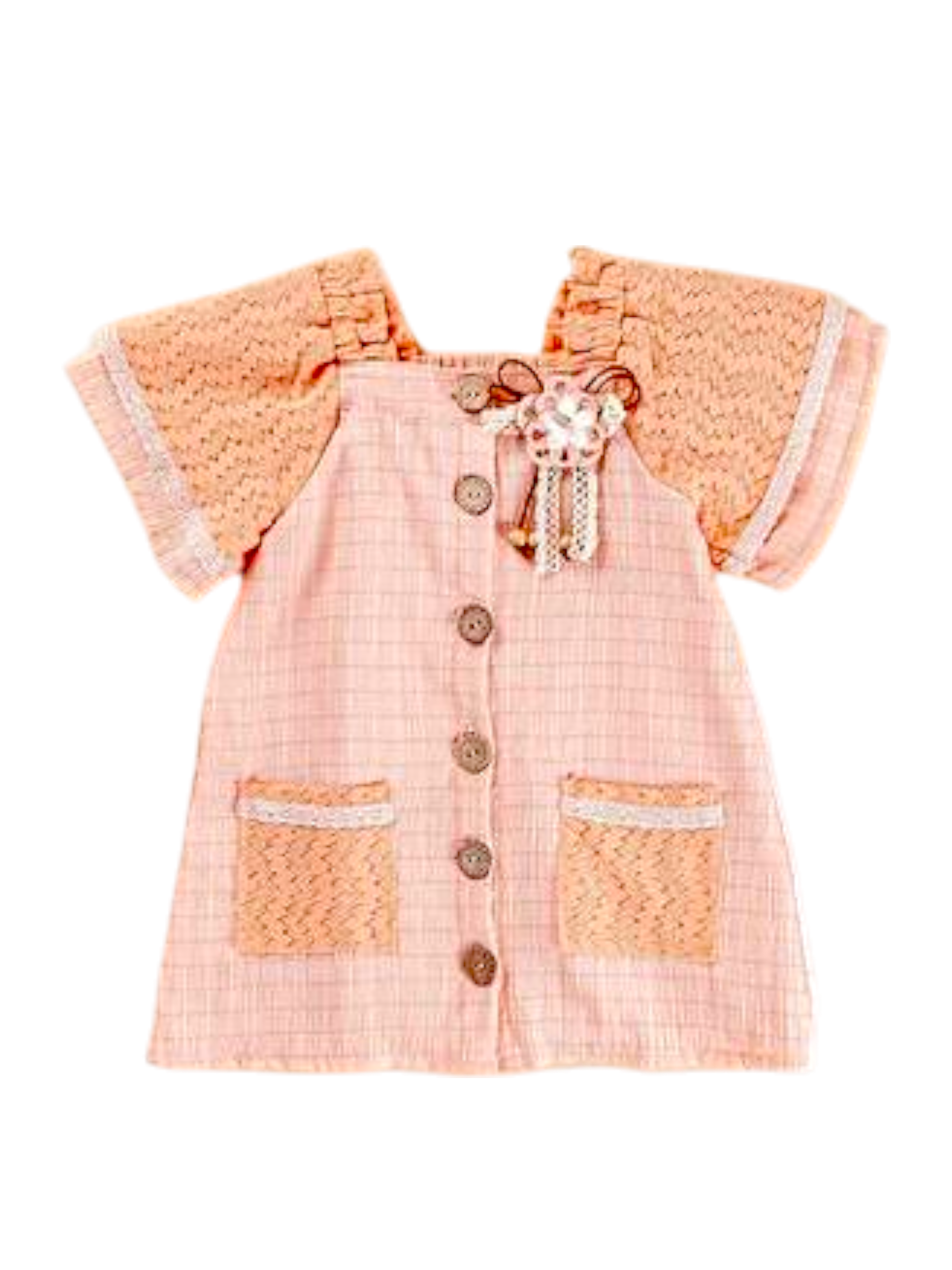 فستان بوهو بقصّة A بلون برتقاليّ مزين بالكروشيه وأزرار خشبية. مبطن بقطن ١٠٠٪. صنع في تركيا.