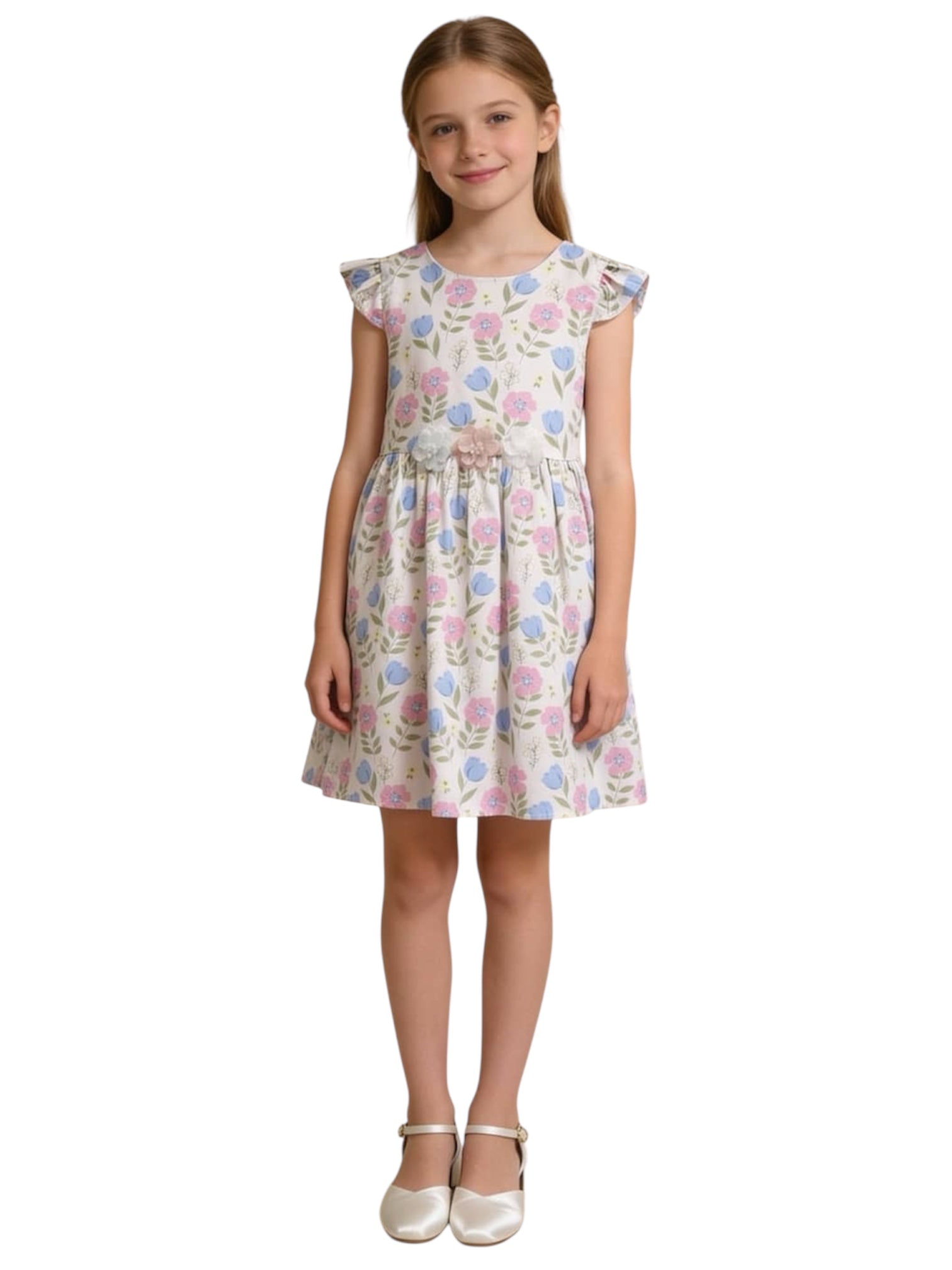 هذا الفستان مصمم بطبعة زهور ربيعية مبهجة ونابضة بالحياة، بأكمام منفوشة ولمسات زهور ثلاثية الأبعاد عند الخصر. مبطن بالكامل بقطن ١٠٠٪ لراحة طفلك.