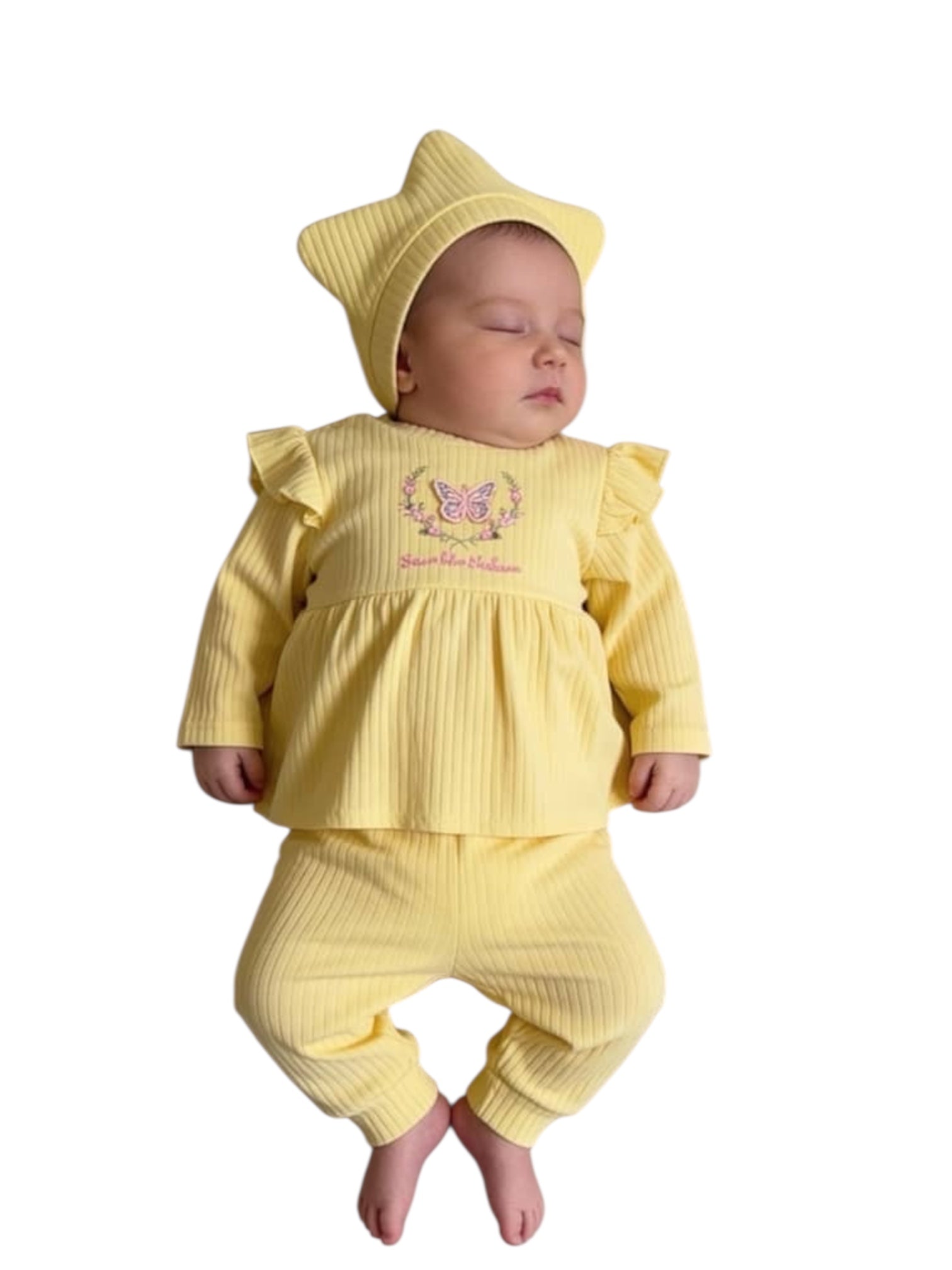 طقم من ثلاث قطع من القطن المضلع، الجزء السفلي، الجزء العلوي مزين بالكشكشة وقبعة على شكل نجمة. صنع في تركيا.