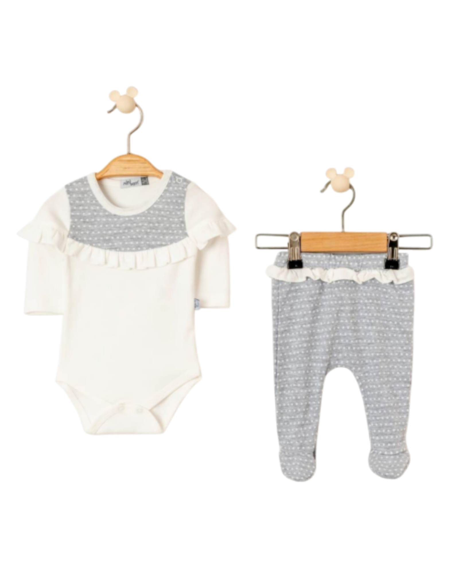 The Luna light grey two-piece baby set features a frill-detailed top and a footed bottom. Made from 100% cotton, it is gentle on your baby’s delicate skin. Comfortable and stylish, perfect for everyday wear or special occasions. Made in Turkey.