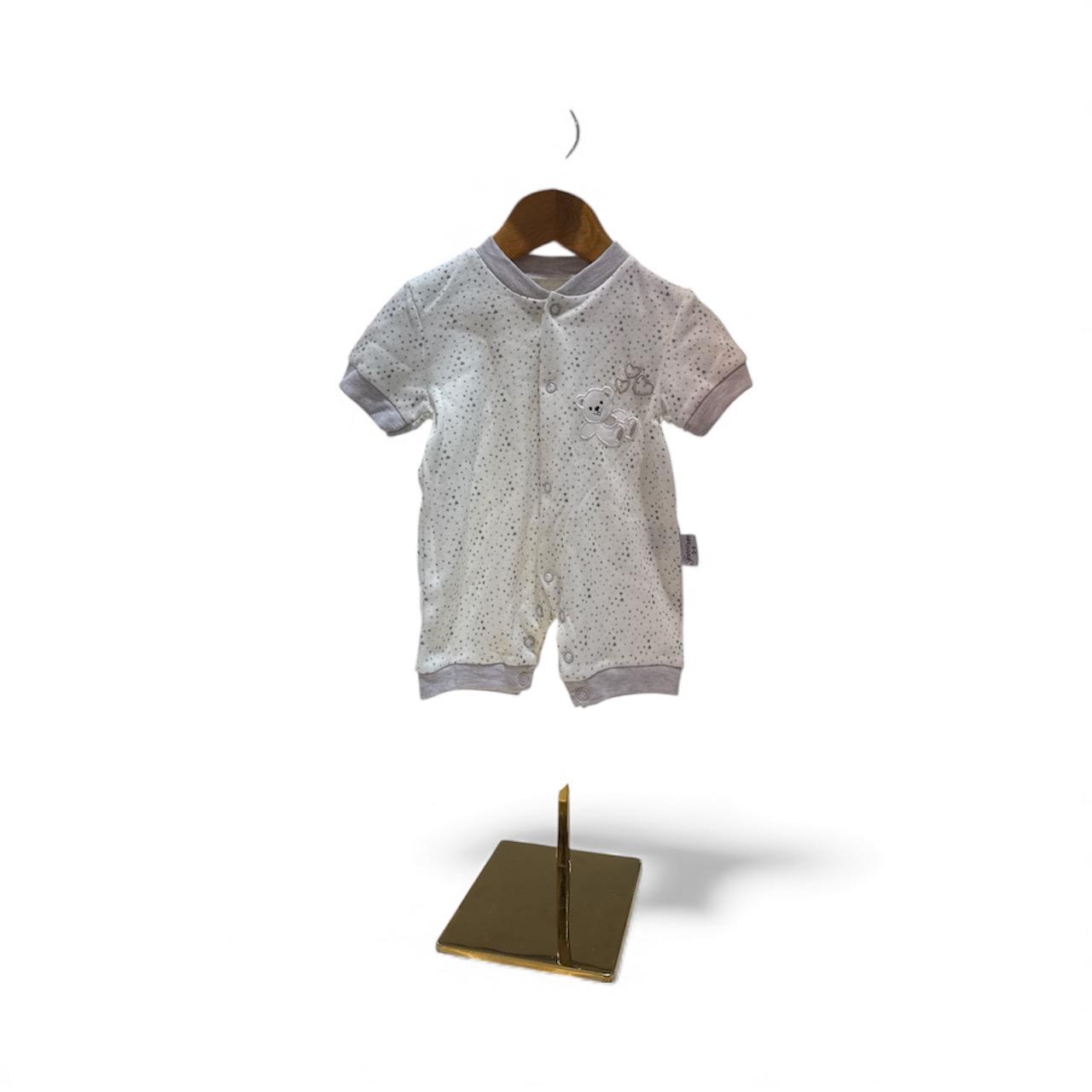 This soft baby romper is made from 100% cotton, offering gentle comfort for your little one. Designed with tiny heart patterns and beige trim details, it combines cuteness with everyday practicality. The snap-button closure allows for easy dressing. Made in Turkey.