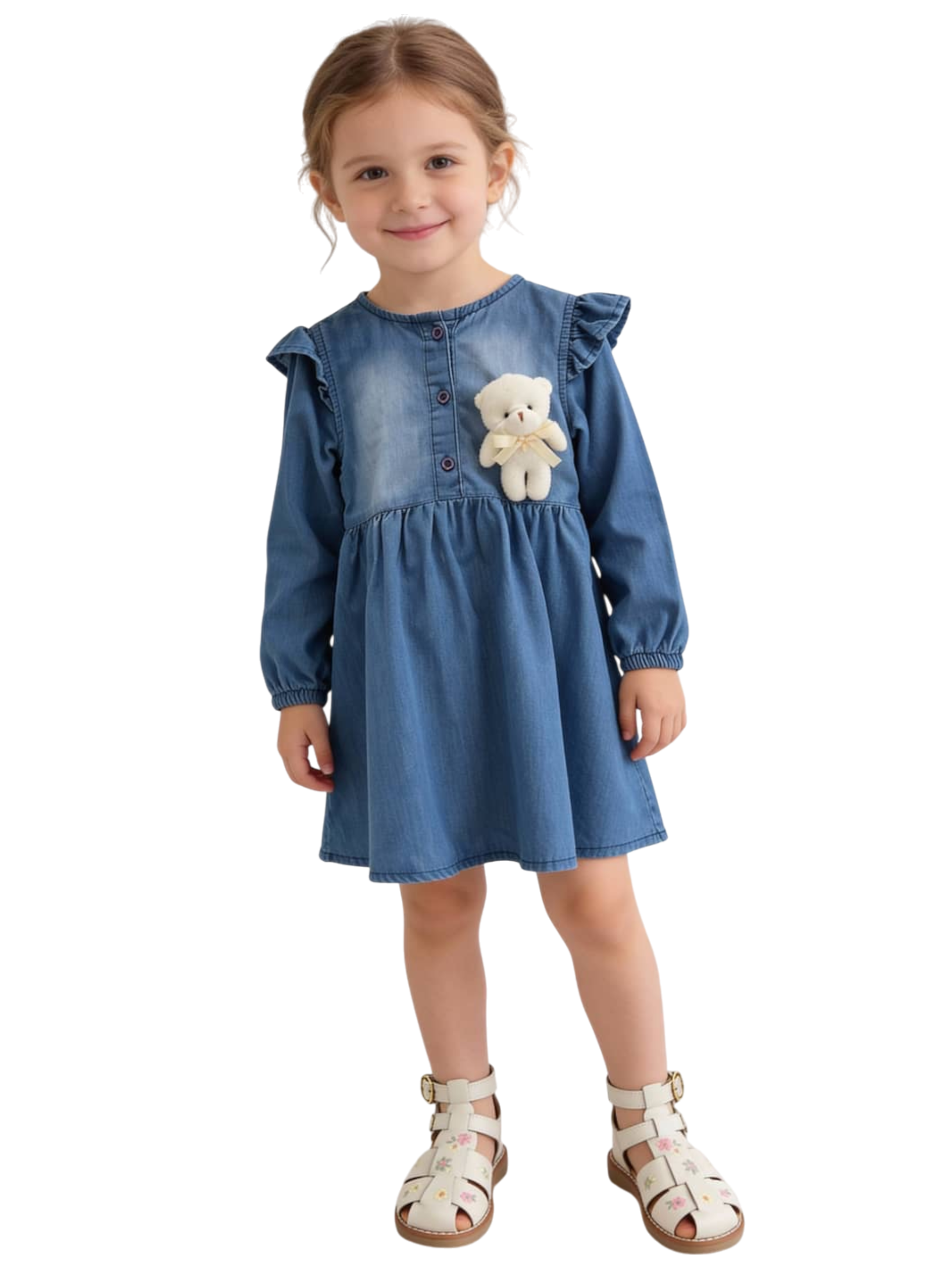 LONG SLEEVE DENIM DRESS WITH TEDDY BEAR ACCESSORY. TEDDY BEAR CAN BE DETACHABLE .