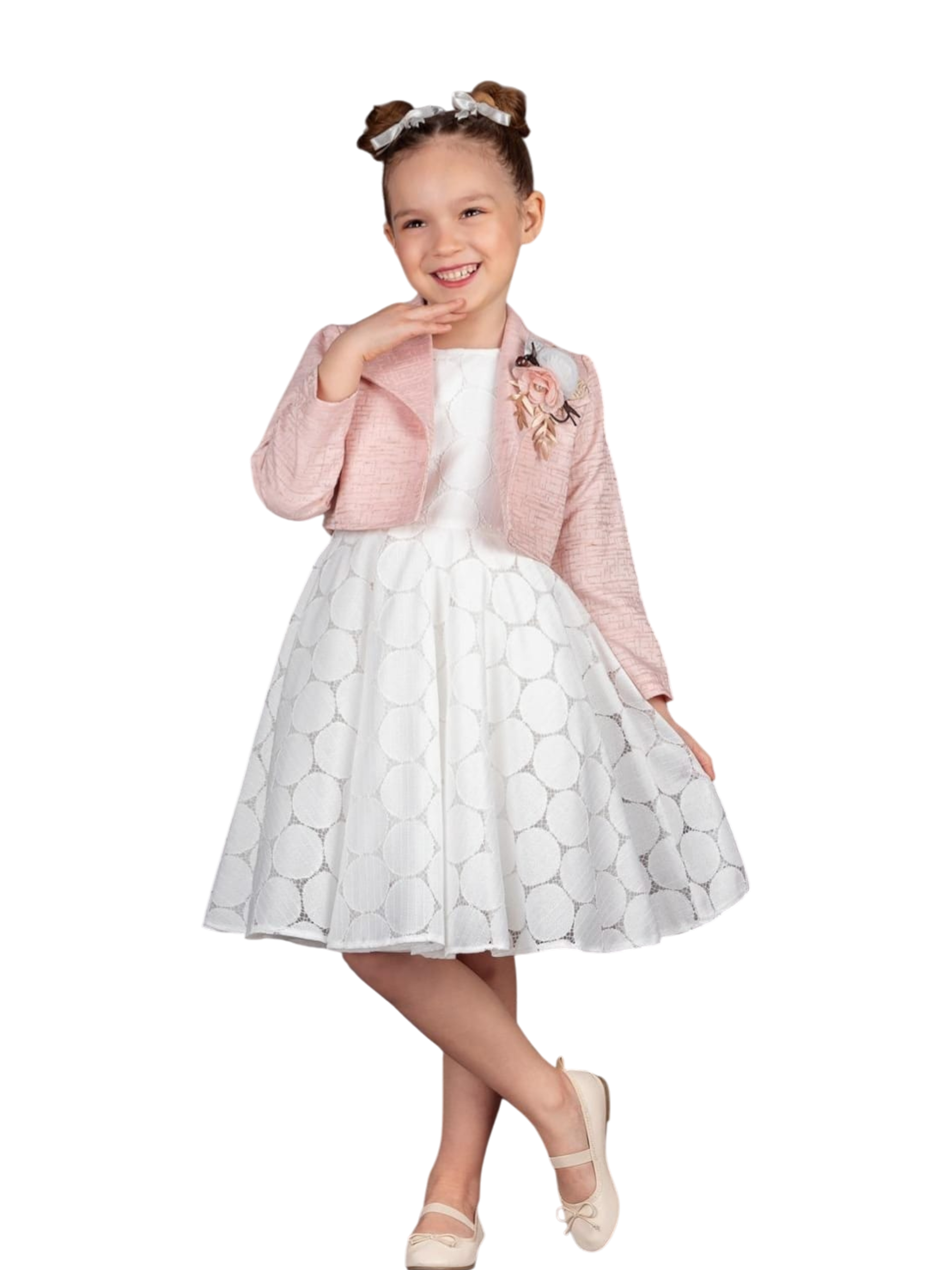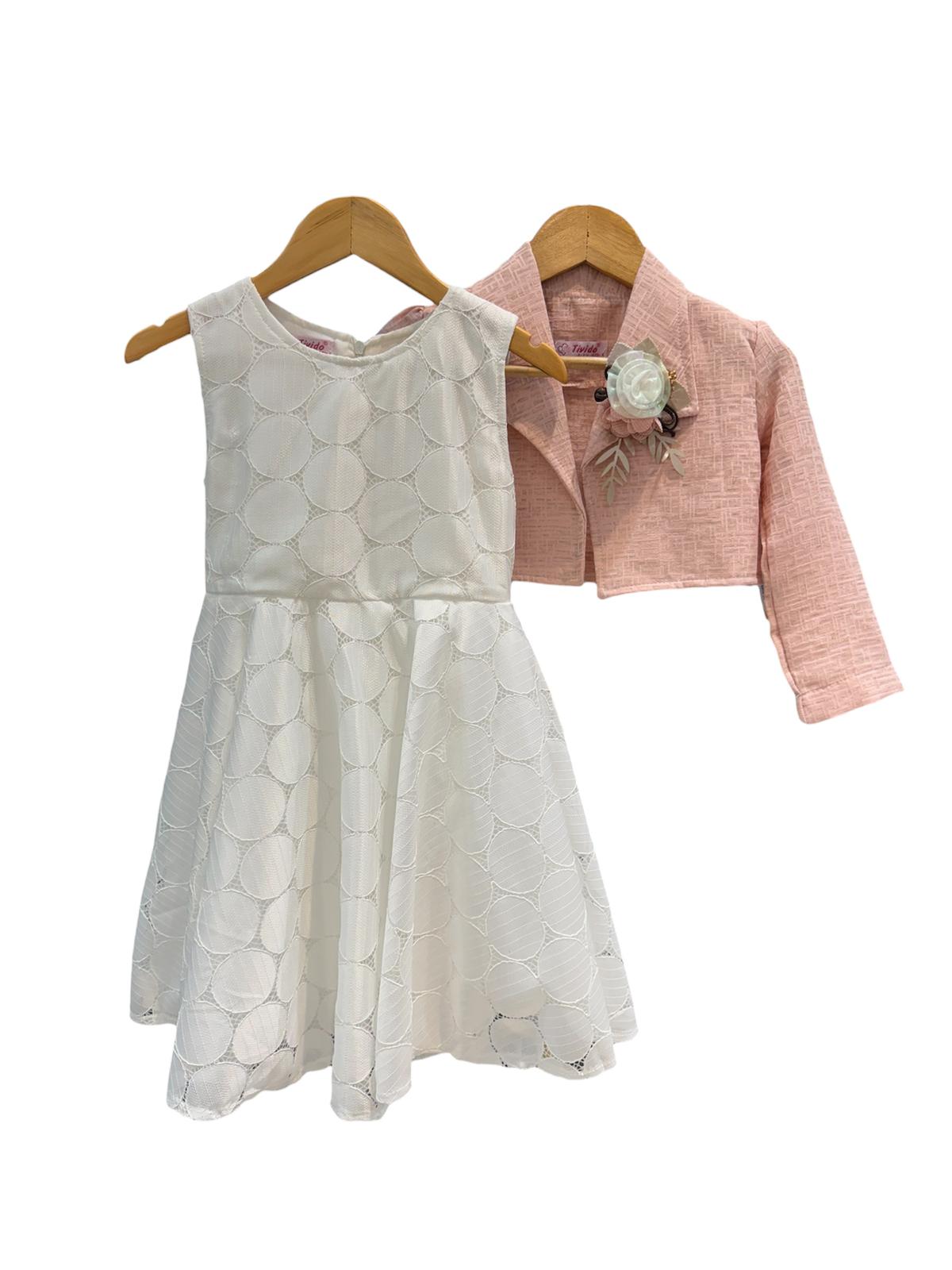 A stylish set featuring a pink blazer-style jacket and a sleeveless white dress with circular patterns and full lining. The dress is complemented with a floral brooch. Perfect for special occasions or elegant everyday wear.