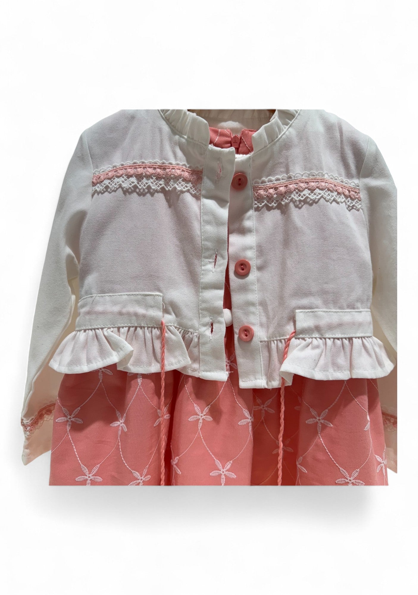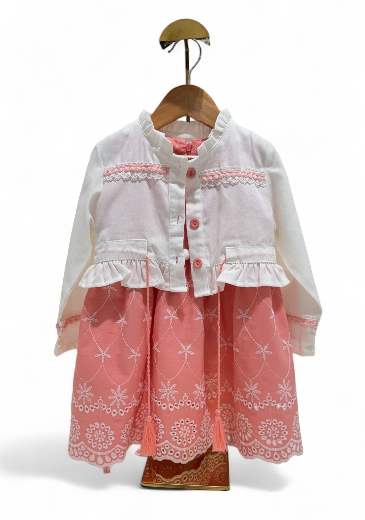MEYRA EMBROIDERY DRESS AND JACKET - PEACH - 2Y is backordered and will ship as soon as it is back in stock.