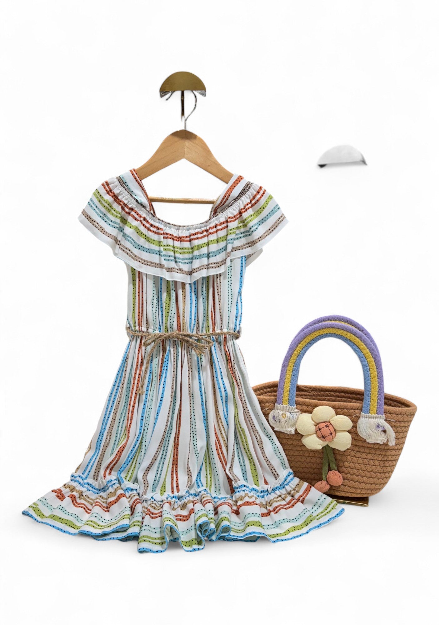 ZANIA MULTICOLOUR FRILL DRESS WITH BELT.