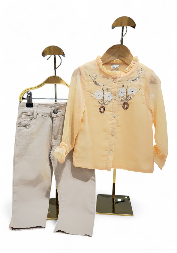 BADE FLORAL CHIFFON TOP AND PANTS SET - BEIGE