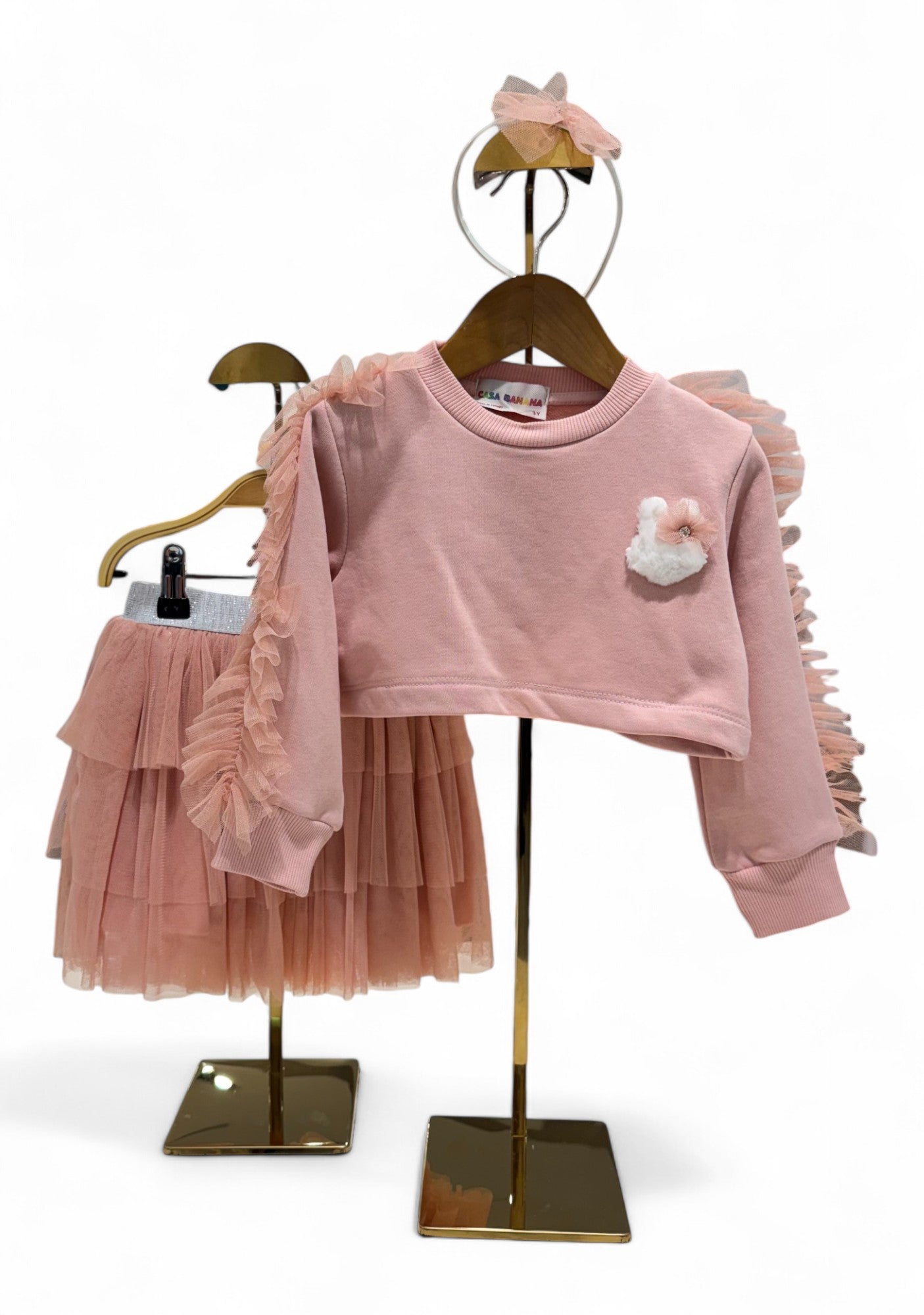 CHICY TUTU SKIRT, TERRY CROP SWEAT TOP AND HEADBAND THREE PIECE LOUNGE SET WITH MINI BUNNY DETAIL.