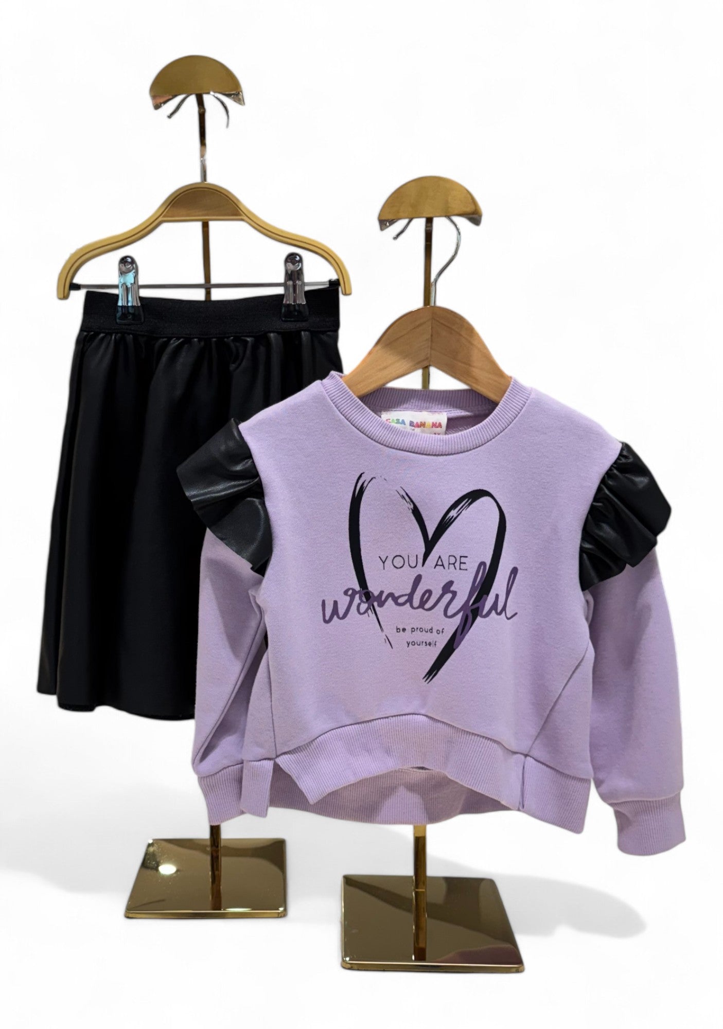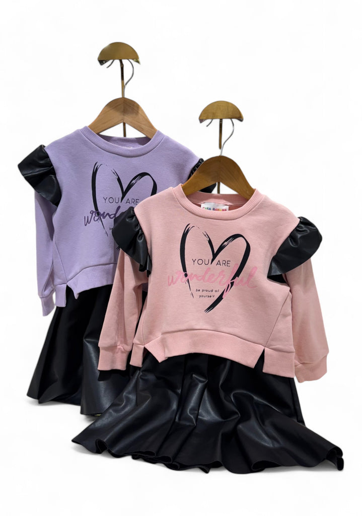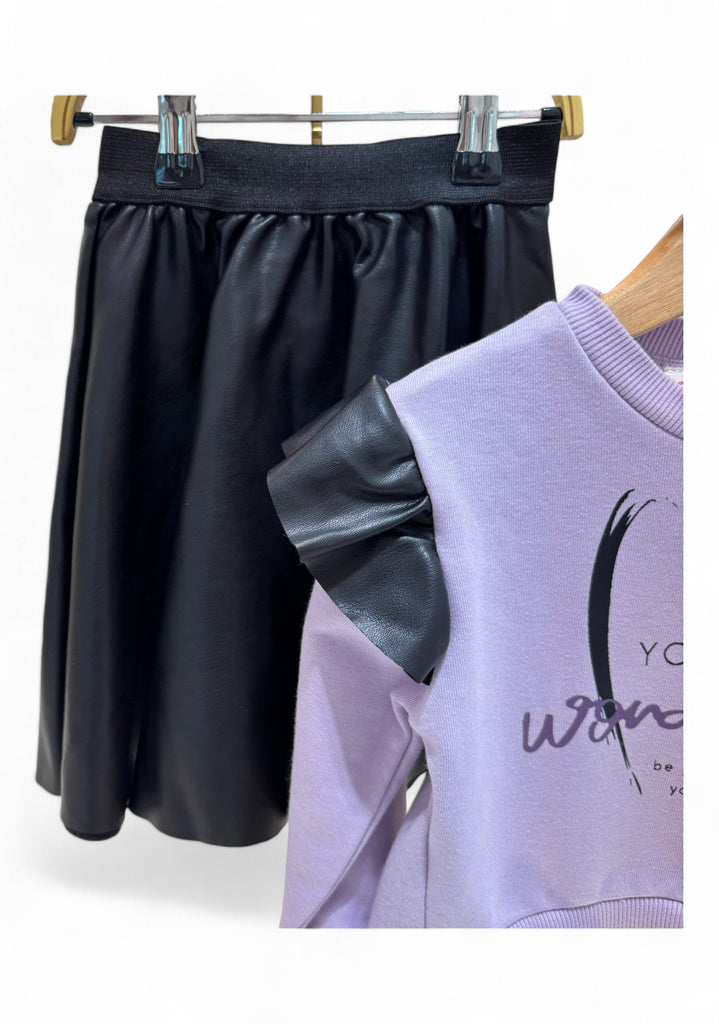 DILAN FAUX LEATHER SKIRT AND FRENCH TERRY WITH FEELCE SWEATSHIRT SET.