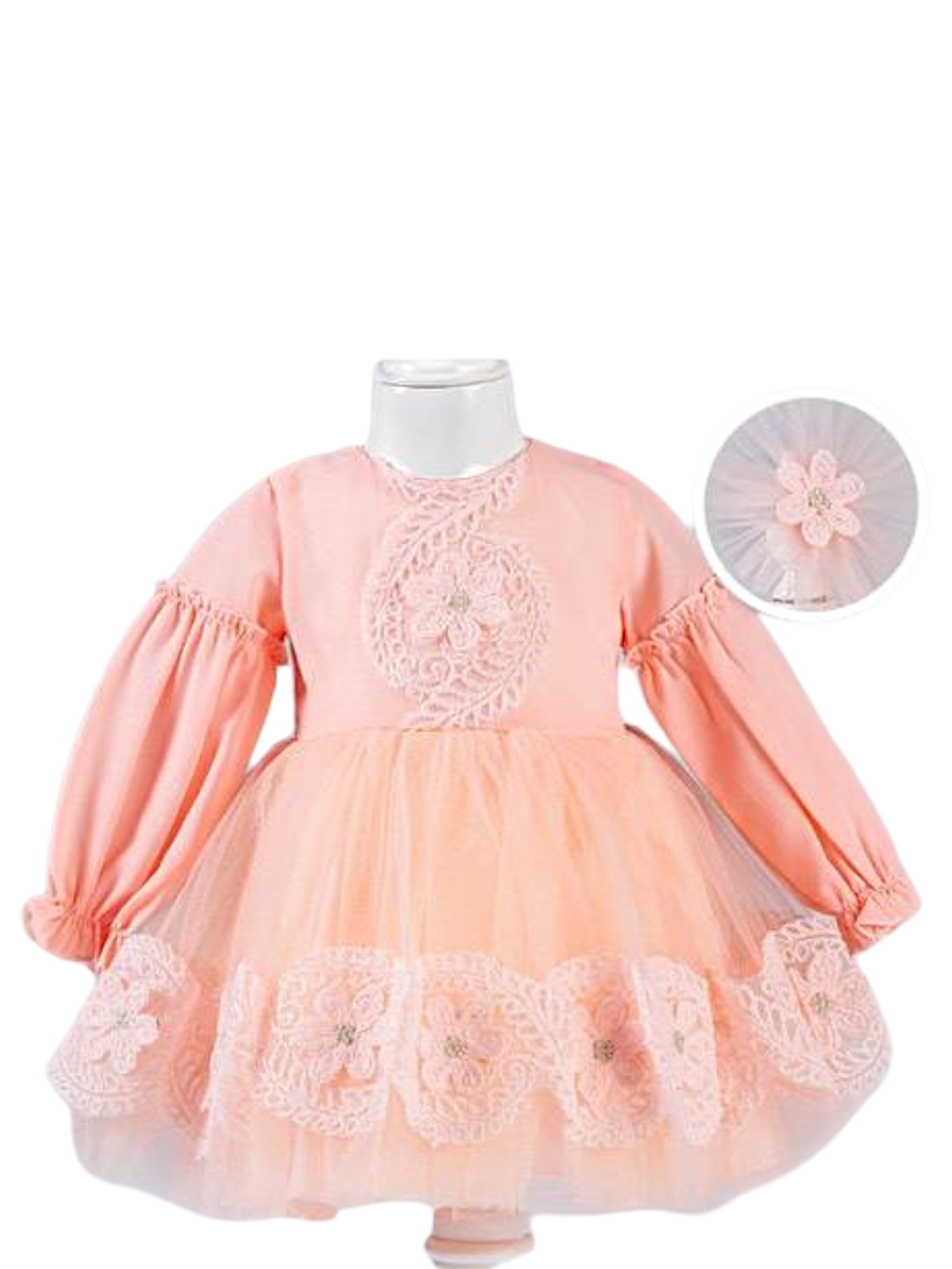 Leyli Dress with Elegant Cotton Embroidery, Floral Appliqués, and Layered Tulle Details. The dress is constructed with a 100% cotton lining. Made in Turkey.