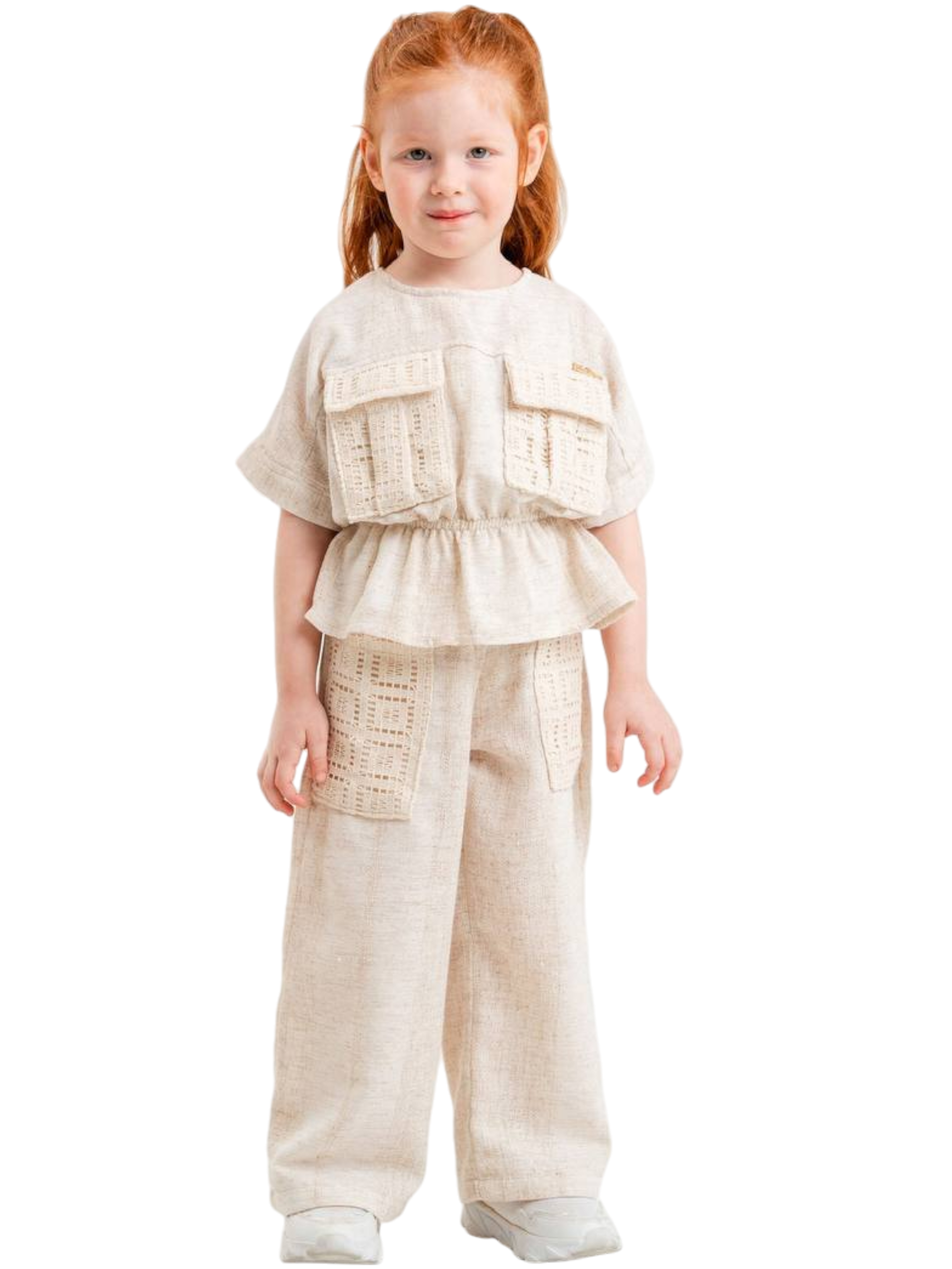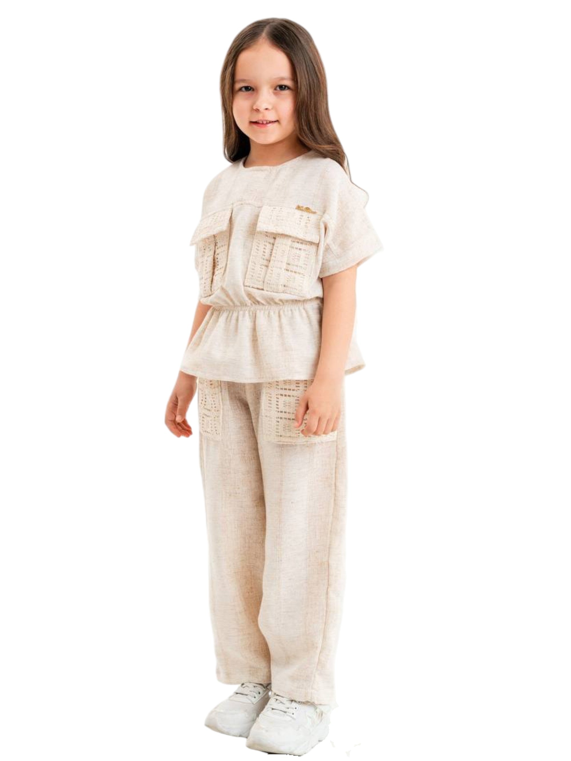 A two-piece set made from linen-look 100% cotton fabric, consisting of a top and wide-leg pants. Both pieces feature large embroidered/woven detailed pockets. Its beige tone offers a modern and comfortable style. Made in Turkey.